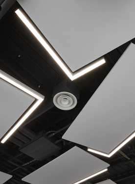 Dans cet espace sont stockées 40 tonnes de plaques d’aluminium. L’atelier comprend des process industriels propres à Radian. Ici sont travaillés les profilés d’aluminium qui intègrent la LED afin de leur donner leur forme définitive, selon des designs développés par Radian. Toute la difficulté consiste à rendre compatibles efficacité lumineuse et confort, et c’est au sein de ce bâtiment que se déploient les travaux de recherche, le façonnage et le savoirfaire de Radian pour atteindre l’objectif du fabricant nantais, « la lumière pertinente ». Le profilé d’aluminium va prendre ici, au fil de différentes étapes, son gabarit, sa forme, son aspect final avec ses caractéristiques photométriques et mécaniques.