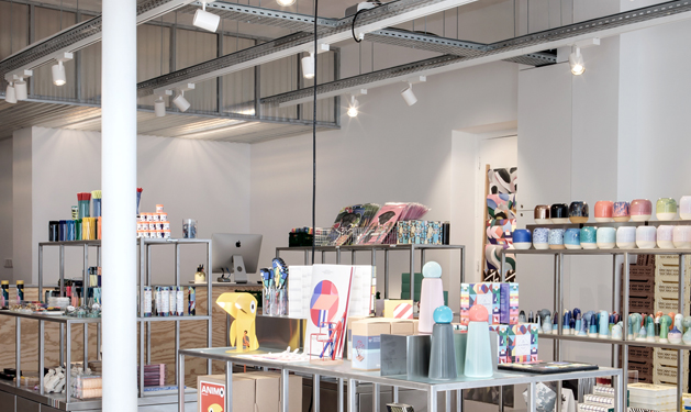 Les chemins de câble sur lesquels vient s’accrocher un système lumineux (projecteurs Tecnica Pro), abaissés d’1 m par rapport au plafond de 3,40 m, accentuent les perspectives visuelles créées par les modules et permettent d’obtenir une lumière précise et directionnelle sur l’objet exposé. Le second espace en retrait de la façade est plus intime. Ici, l’usager crée ses propres objets sur mesure. L’esprit du lieu est confiné, les matériaux plus chauds, la lumière plus diffuse et immersive. En jouant sur différentes intensités, la compression et la dilatation de l’espace, les architectes offrent une expérience sensible, une zone tampon qui amorce le dernier espace : l’atelier de fabrication de la papeterie. Cette dernière sphère est réservée aux employés. Une large partie est baignée de lumière naturelle par l’apport zénithal de pavés de verre, dont les dalles LED iPlan prennent le relais. La dilatation est à son maximum, elle incite le visiteur à observer les machines, les artisans, le savoir-faire de Papier Tigre à travers un rideau à lanières en PVC souple et transparent. Les vues sont dégagées. L’atelier, visible depuis la rue, participe à la lecture transversale du showroom et l’ouverture de celui-ci vers l’extérieur. Cent 15 Architecture prend le parti du minimalisme pour mettre en valeur l’identité très marquée de Papier Tigre, en travaillant tout particulièrement l’homogénéité des matériaux, les ambiances lumineuses et les perspectives visuelles.