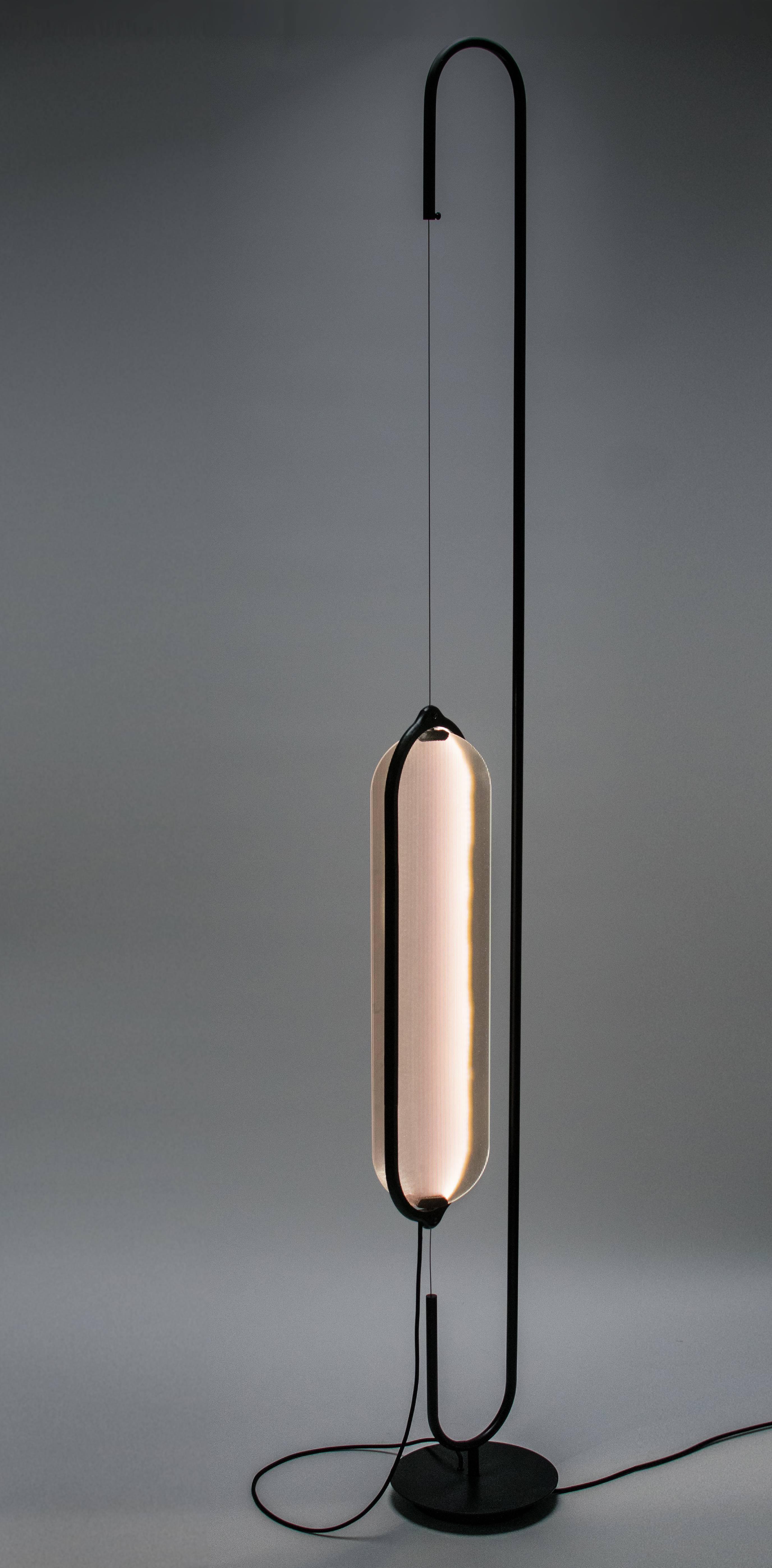 « Dans la conception de ce luminaire, explique Rùben Valdez, le point de départ est le besoin, le problème, auquel il doit apporter une réponse. J’ai voulu m’imposer comme cadre de travail un espace de vie tel que le salon. Dans cet espace, on a souvent plusieurs sources lumineuses en fonction du moment de la journée, du besoin et de l’ambiance. J’ai commencé par me fixer deux ambiances : dans la première, un important apport lumineux pour tous les moments de vie et de mouvement dans l’espace : un lustre ou un lampadaire lambda pourrait répondre à ce besoin ; la deuxième ambiance plus tamisée, moins intense, offre un moment plus calme, chaleureux. Deux besoins, deux ambiances, donc deux matériaux qui diffusent la lumière différemment.