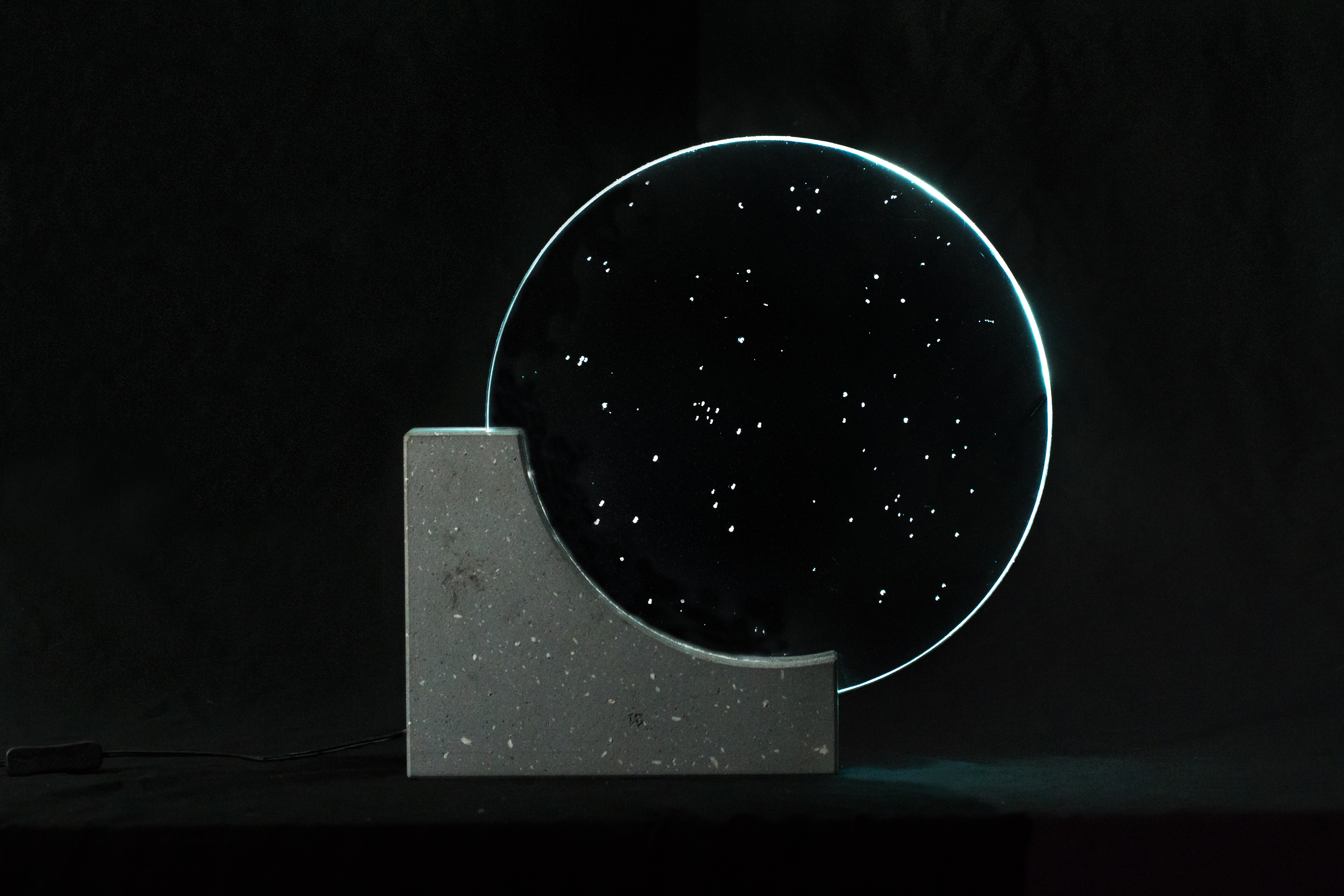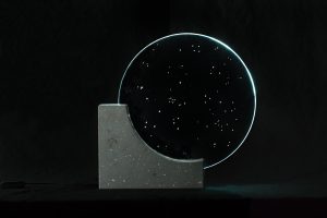 A partir de cette dualité entre les deux matériaux et deux ambiances, je me suis posé la question du passage de l’un à l’autre. J’ai trouvé intéressant d’avoir une source lumineuse fixe, et que ce soit les deux plaques de deux matériaux différents qui tournent sur elles-mêmes, selon un axe vertical. L’utilisateur peut changer l’ambiance lumineuse de son espace en faisant pivoter une plaque de verre en la poussant du doigt.