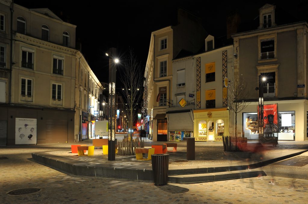 Située à la confluence des rivières de la Sarthe et de l’Huisne, Le Mans, labellisée Ville d’art et d’histoire, a entrepris le réaménagement complet du quartier Saint-Nicolas. « Ces travaux, explique Élodie Gourrier, du service de l’Aménagement urbain à la direction du Développement urbain, concernent aussi bien les revêtements que le mobilier urbain, les plantations et, bien sûr, l’éclairage. » Ce dernier n’avait pas été modifié depuis la piétonnisation du quartier et n’était plus du tout adapté à la configuration actuelle. De plus, il fonctionnait avec des appliques équipées de sources traditionnelles très énergivores. « Nous avons lancé un appel d’offres et c’est l’agence Coup d’Éclat qui a été retenue : Florian Colin était déjà intervenu sur l’éclairage public dans la commune d’Arnage, nous connaissions donc déjà sa manière de travailler, même si pour ce projet, le contexte était différent car le quartier Saint-Nicolas comprend de nombreuses rues commerçantes, et il est entouré de places historiques comme la place de la République et celle des Jacobins. Nous avons demandé d’ailleurs à Florian Colin de prendre en compte cette configuration afin que le concept d’éclairage connecte ces lieux au quartier. »