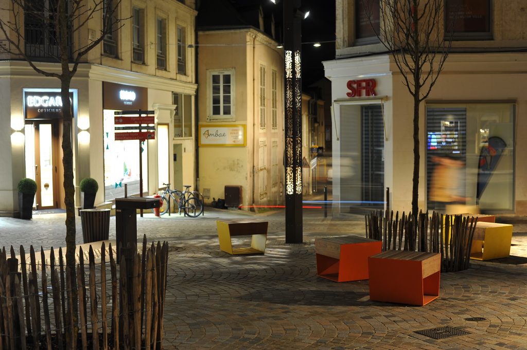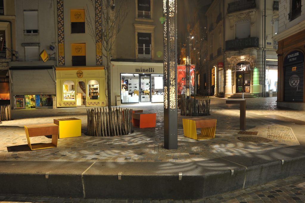Dans la mise en œuvre de cette première phase, une nappe de lumière douce et confortable accompagne les cheminements sans aucune nuisance lumineuse (façade ou ciel). La multiplication de discrets luminaires fabriqués sur mesure permet de réduire considérablement les luminances et dans le même geste, de marquer l’axe historique de la place de la République à la place des Jacobins, par une ponctuation colorée, à la fois guide et repère.