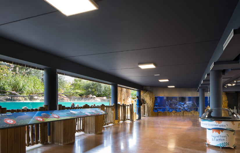 Dans la salle « muséographique », à double fonction, qui donne d’un côté sur le bassin des hippopotames situé à l’extérieur, et de l’autre côté, sur les objets et tableaux accrochés au mur et accompagnés de cartels, Nuno Paroco a choisi d’associer deux mises en lumière : « Des dalles LED installées en saillie du côté de la lumière du jour et au-dessus des circulations, tandis que des projecteurs Start Track Spot Integral à faisceau étroit, positionnés sur des rails, sont dirigés sur les parois où l’on peut lire les informations relatives à l’histoire du zoo. »