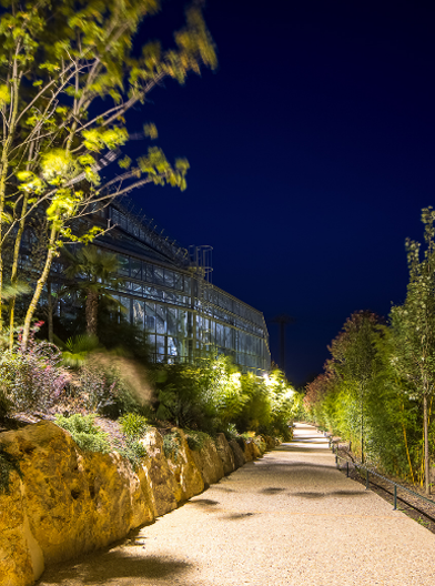 S’ajoute à cet éclairage général une « cheminée de lumière » de teinte plus chaude (3 000 K), dont le flux part du bas et monte en un étroit faisceau jusqu’au centre du dôme. « Entre les deux, il n’y a aucun appareil, souligne David Amourous, la lumière est reflétée par les végétaux et la structure métallique. »