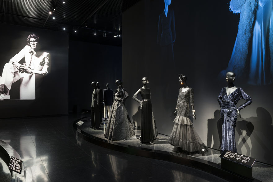 La salle d’exposition permanente du musée est l’œuvre de l’architecte et scénographe français Christophe Martin, qui a délibérément choisi de ne pas mettre en scène une rétrospective classique dans le nouveau musée de Marrakech. Pour des raisons de conservation, les œuvres présentées sont remplacées à intervalles réguliers par d’autres modèles haute couture de la collection de la Fondation Pierre Bergé, qui compte au total plus de 3 000 pièces. Cette mesure a permis de ne pas les exposer trop longtemps. C’est pour cette même raison que la technique LED a été choisie pour l’éclairage. Akari-Lisa Ishii, conceptrice lumière, a conçu l’éclairage architectural du musée : de la cour d’entrée dotée d’un monolithe sur lequel se détachent les lettres YSL, jusqu’à la boutique du musée, en passant par l’auditorium. Akari-Lisa Ishii explique : « Les LED n’émettent presque pas de rayonnement thermique et UV, ce qui constitue un atout majeur lors de la mise en lumière des textiles sensibles et très précieux. »