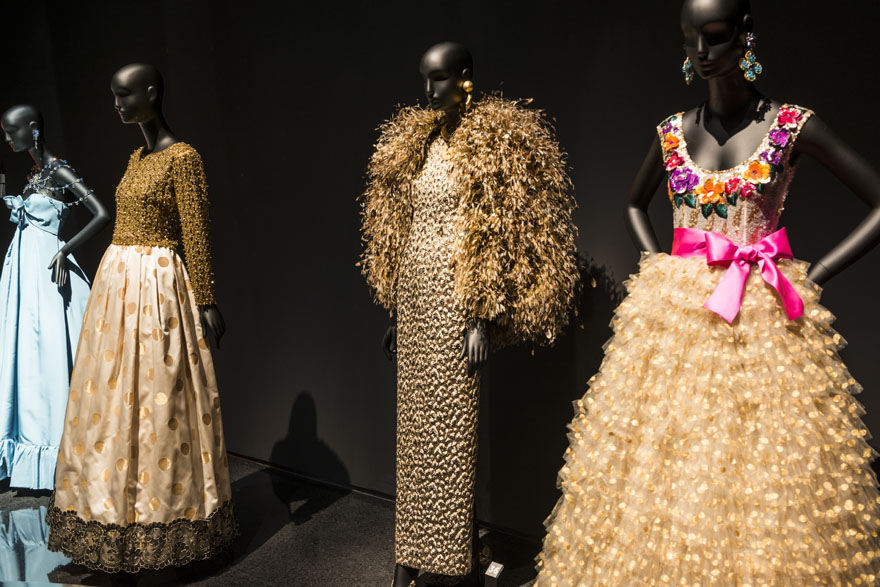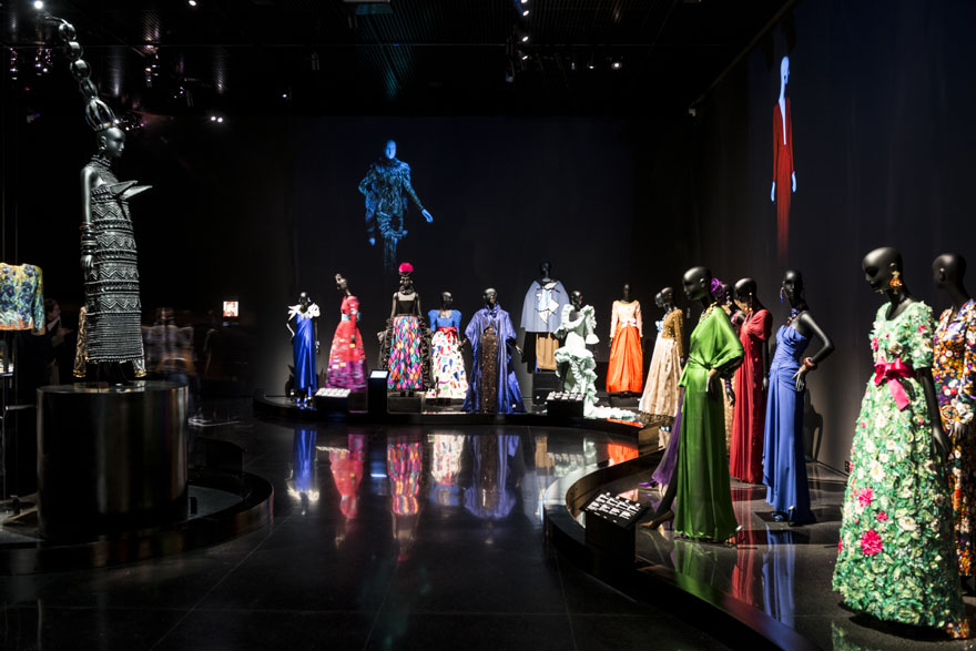 Puis le visiteur découvre les cinquante modèles exposés sur des mannequins. Cette forme d’éclairage, qui dramatise la mise en scène, témoigne de la relation qui unit Christophe Martin au théâtre. Après avoir terminé ses études d’architecture, il a travaillé pendant plus de douze ans à la création de décors d’opéra et de théâtre. Le confort visuel, extrêmement important pour les spectateurs qui assistent à un opéra ou à une pièce de théâtre, l’est tout autant pour les visiteurs d’un musée. L’éclairage d’accentuation, réalisé avec des projecteurs contours Optec, modèle et délimite nettement les textures, les broderies, les volants et les drapés, faisant même ressortir les vêtements noirs sur fond noir.