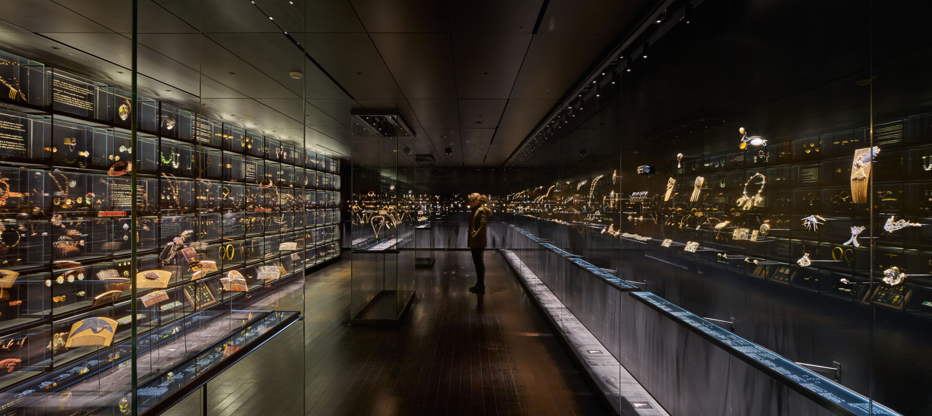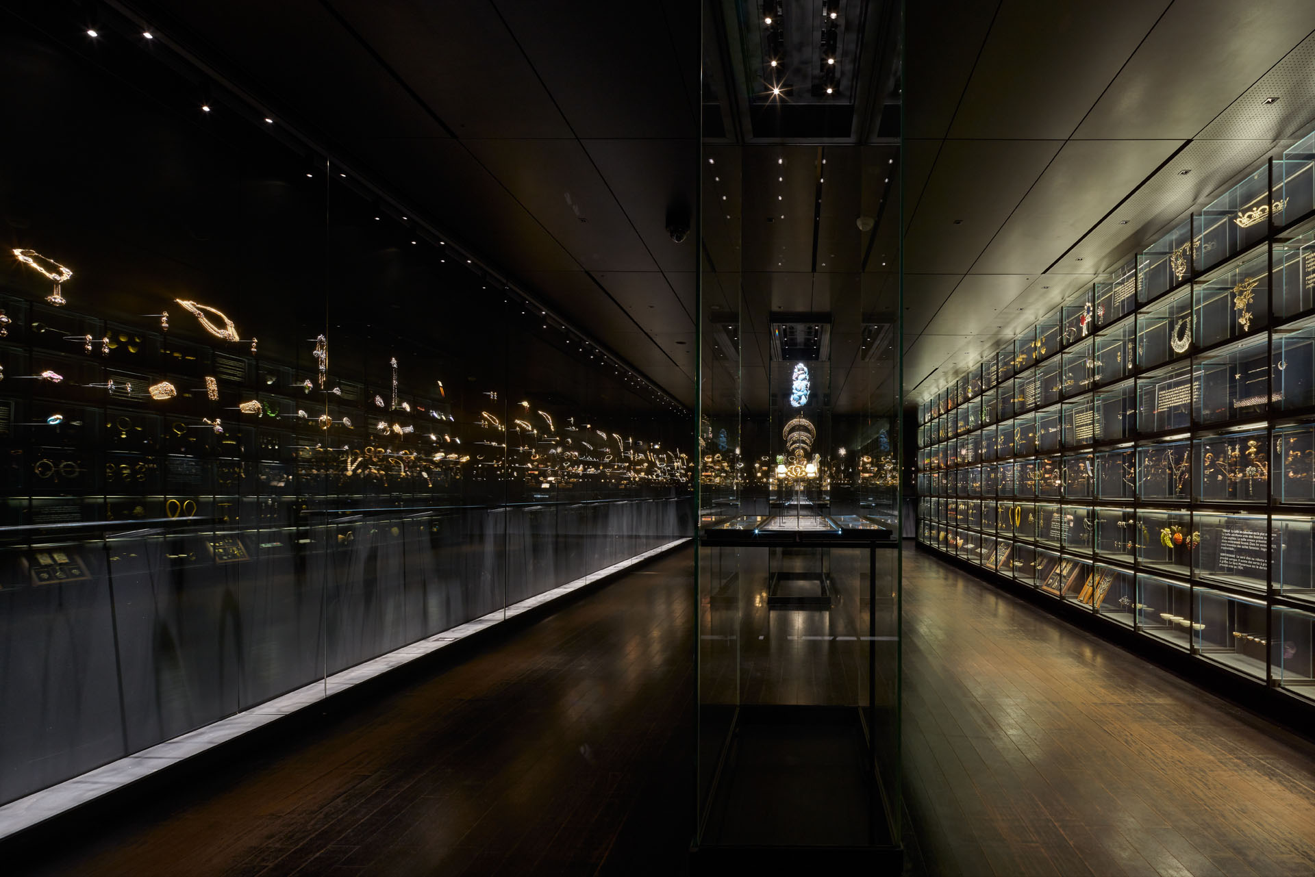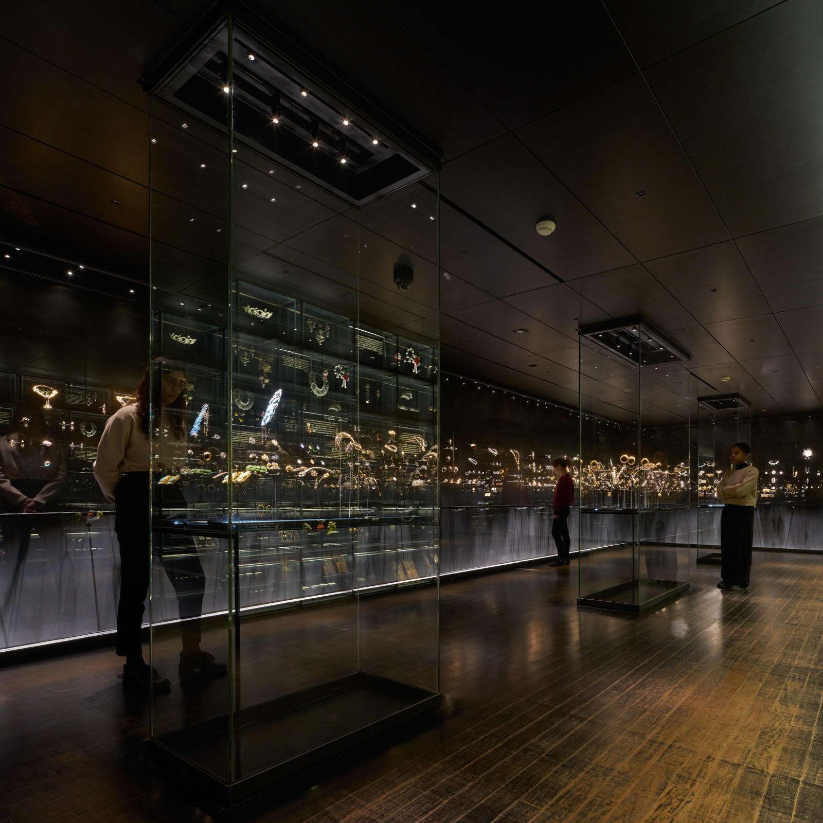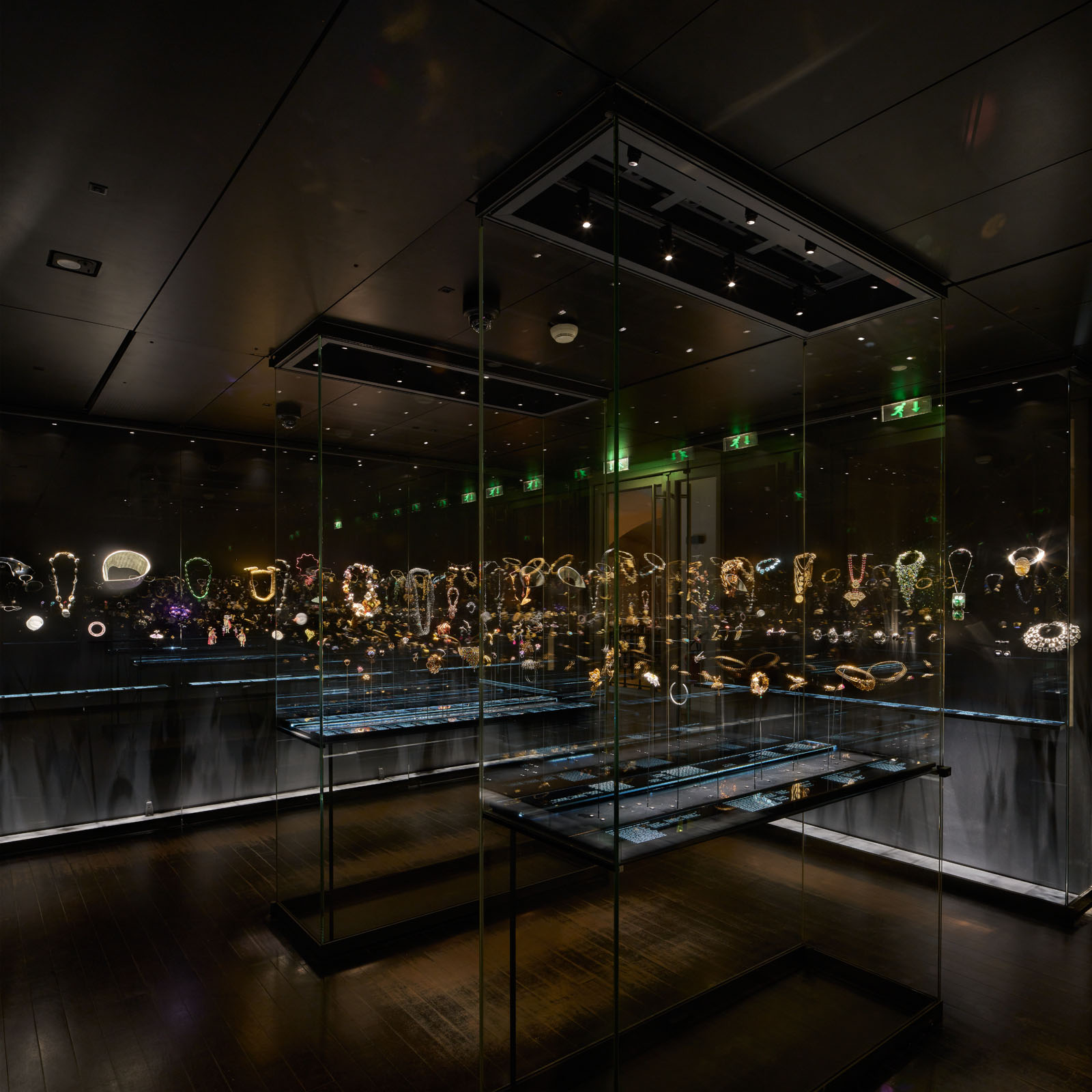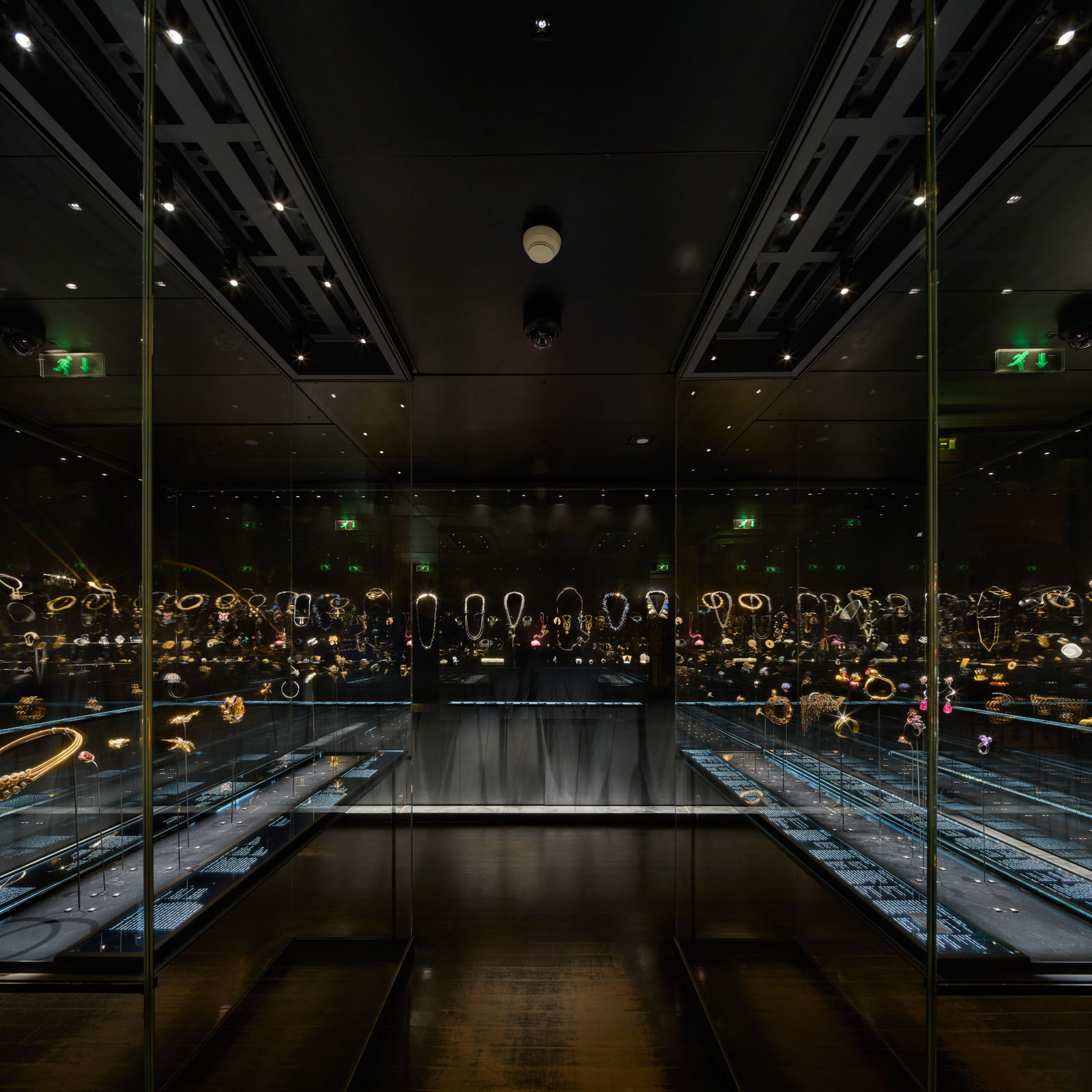 Les appareils iGuzzini ont été choisis après une série de tests. La configuration apportée à l’aménagement dès la première intervention de Roberto Ostinelli n’a pas changé. Les reflets qui n’ont pas pu être éliminés ont été exploités pour créer une illusion d’optique : les bijoux sont agencés dans les vitrines selon la position qu’ils occuperaient sur un corps humain, et avec le reflet, le visiteur voit le bijou sur lui-même. La température couleur choisie de 4 000 K met l’or en valeur et fait resplendir les pierres précieuses, ainsi que les émaux.