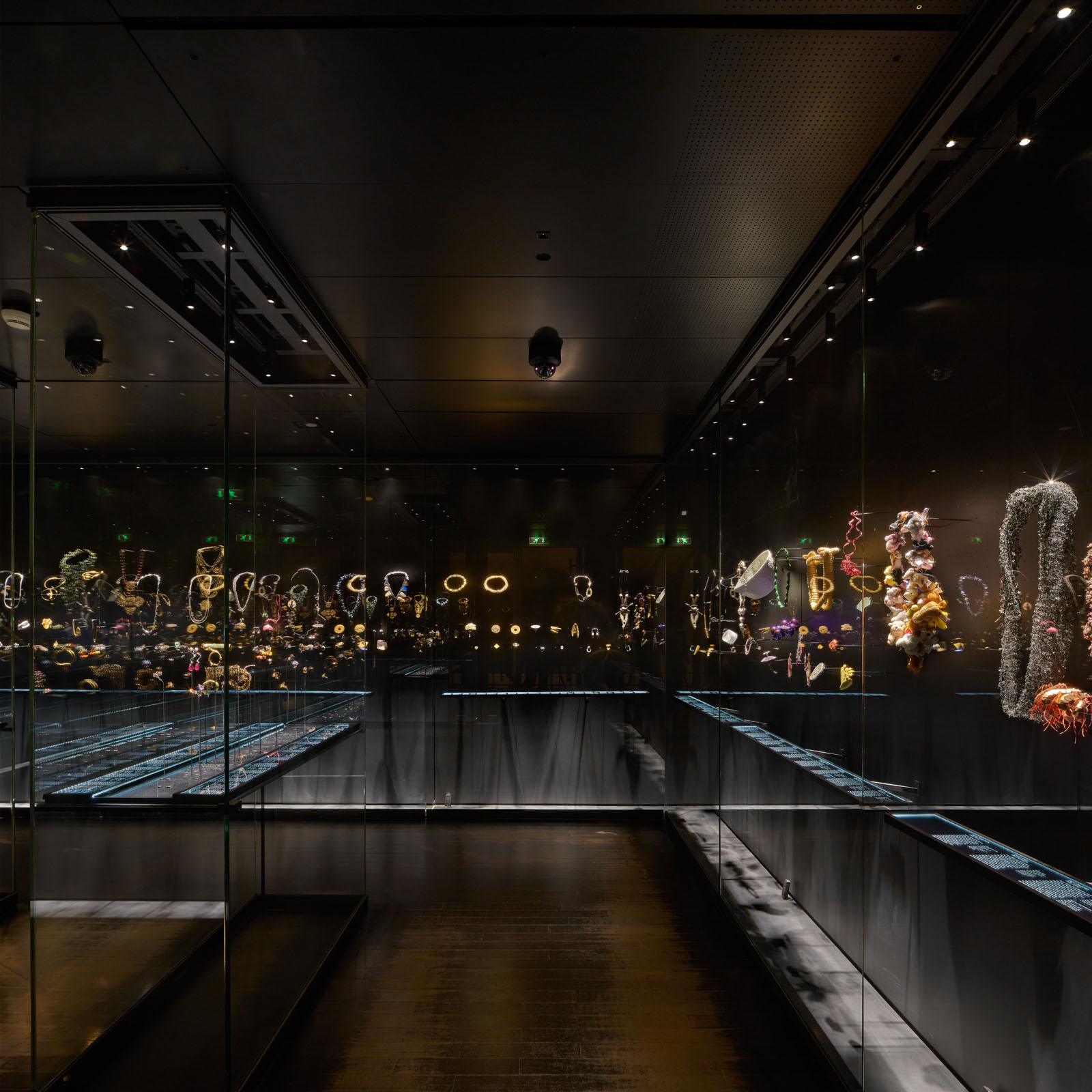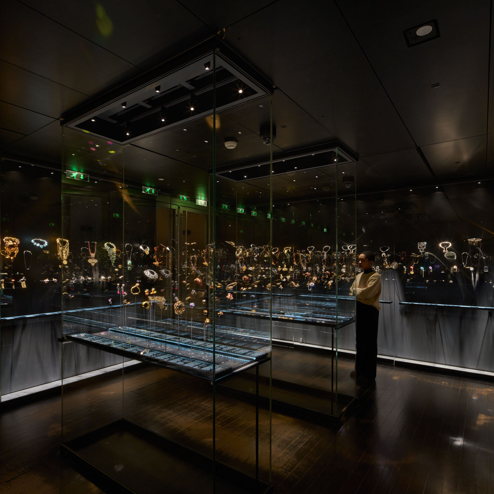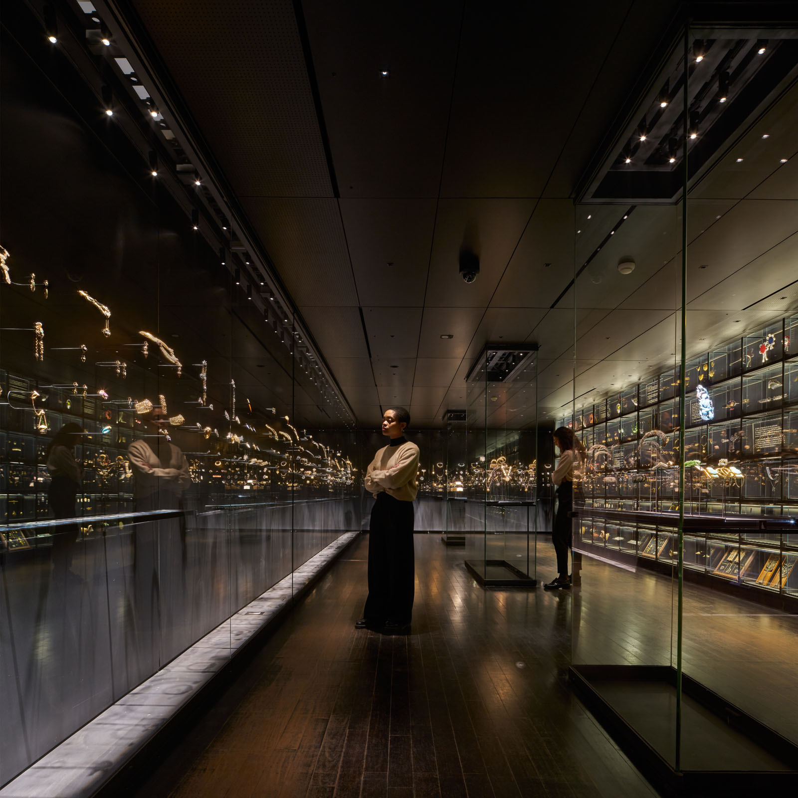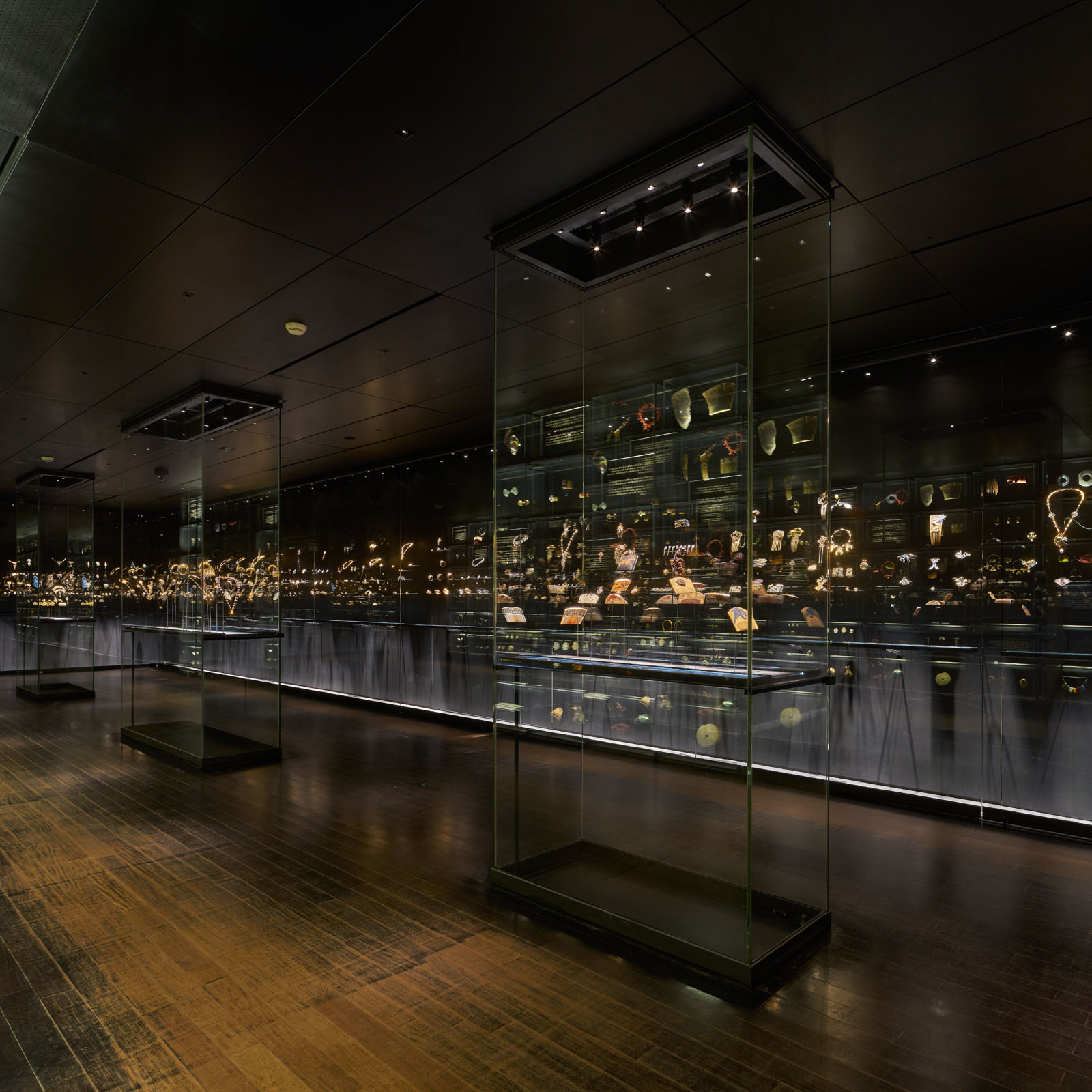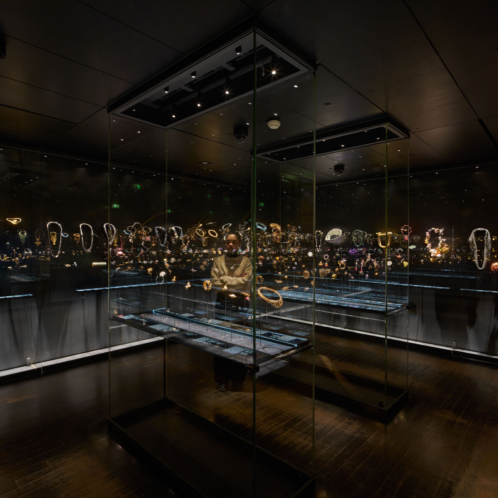Les appareils iGuzzini ont été choisis après une série de tests. La configuration apportée à l’aménagement dès la première intervention de Roberto Ostinelli n’a pas changé. Les reflets qui n’ont pas pu être éliminés ont été exploités pour créer une illusion d’optique : les bijoux sont agencés dans les vitrines selon la position qu’ils occuperaient sur un corps humain, et avec le reflet, le visiteur voit le bijou sur lui-même. La température couleur choisie de 4 000 K met l’or en valeur et fait resplendir les pierres précieuses, ainsi que les émaux.