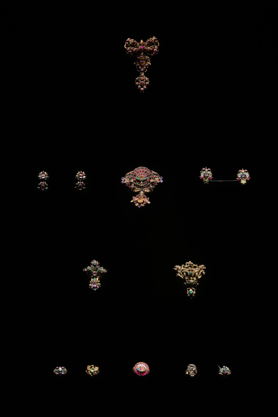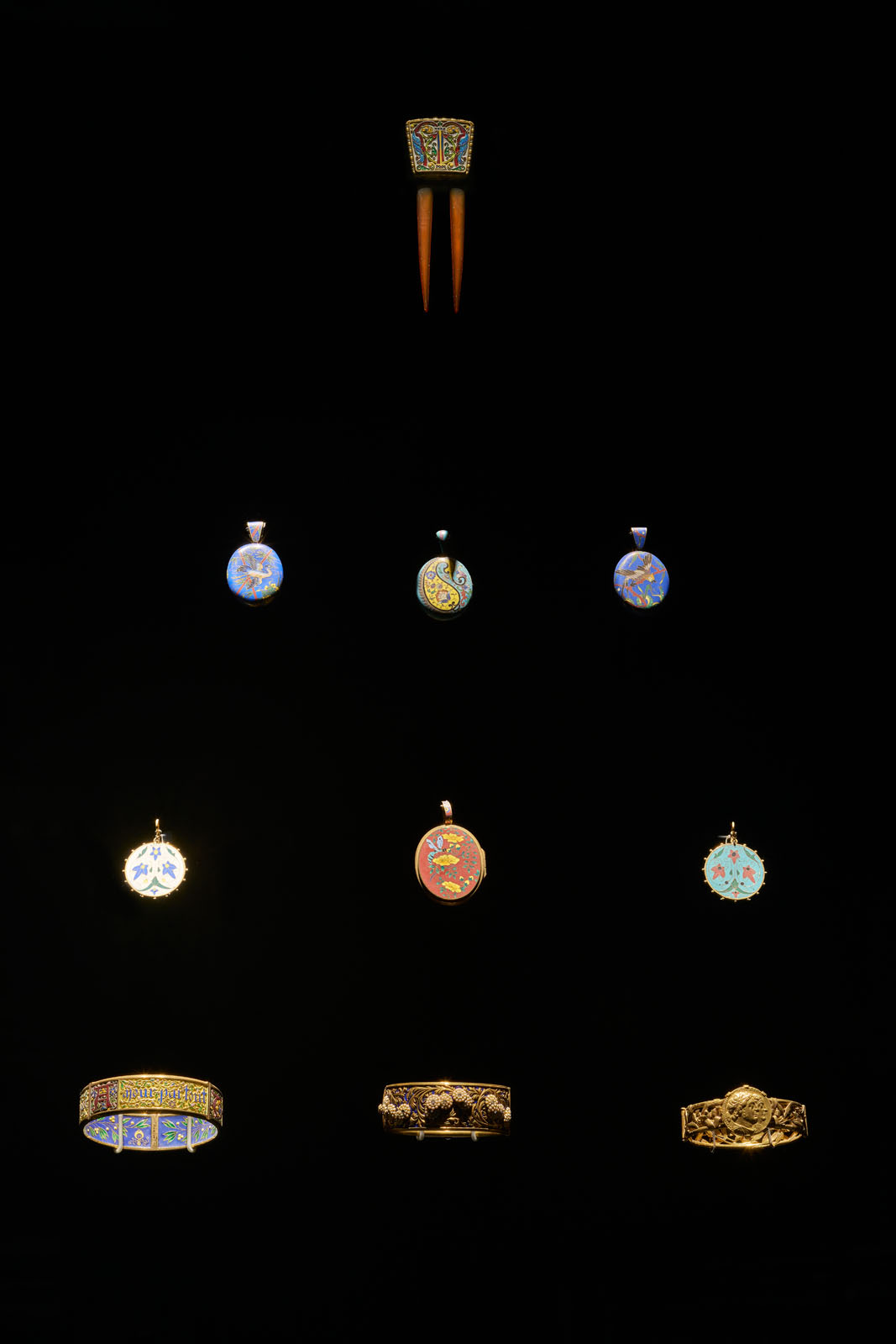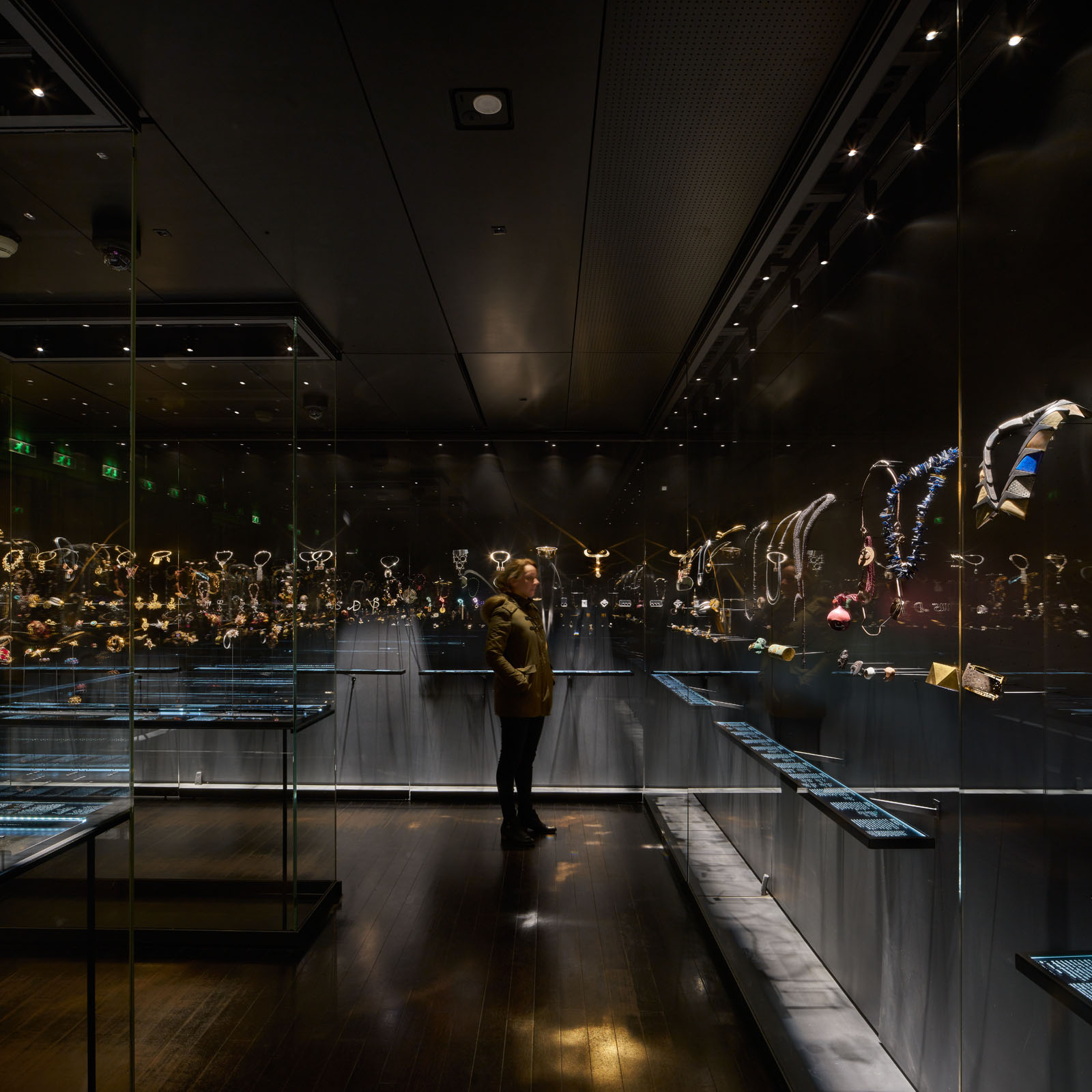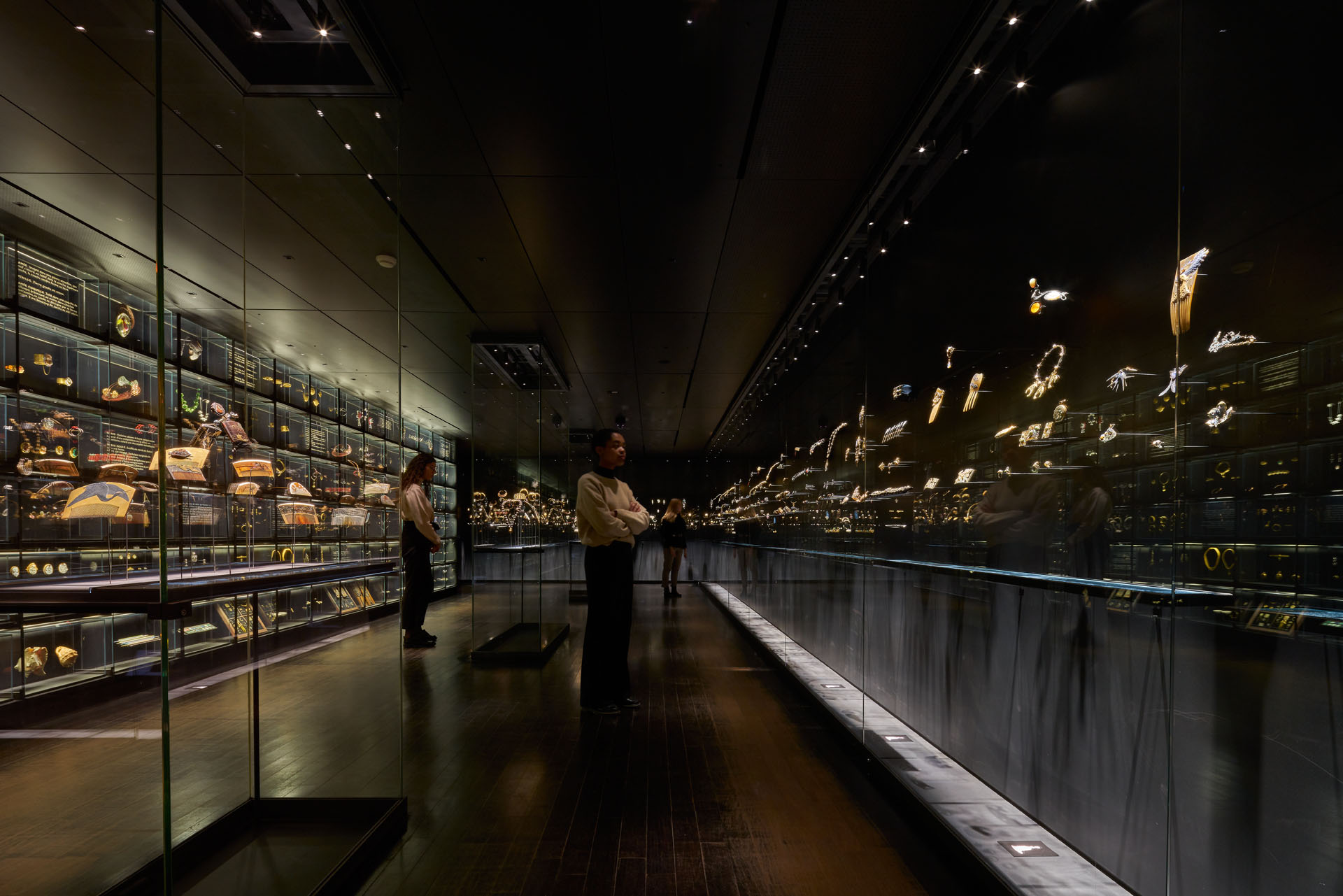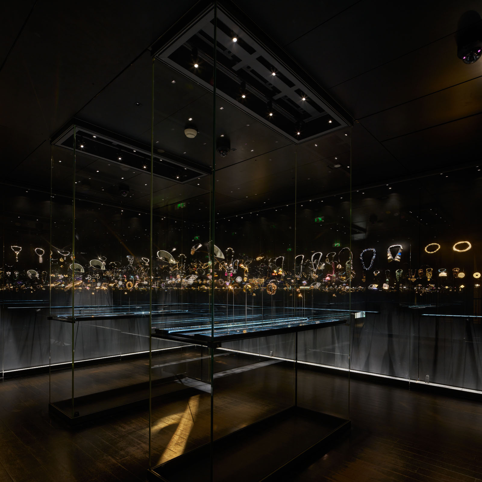 Les appareils iGuzzini ont été choisis après une série de tests. La configuration apportée à l’aménagement dès la première intervention de Roberto Ostinelli n’a pas changé. Les reflets qui n’ont pas pu être éliminés ont été exploités pour créer une illusion d’optique : les bijoux sont agencés dans les vitrines selon la position qu’ils occuperaient sur un corps humain, et avec le reflet, le visiteur voit le bijou sur lui-même. La température couleur choisie de 4 000 K met l’or en valeur et fait resplendir les pierres précieuses, ainsi que les émaux.