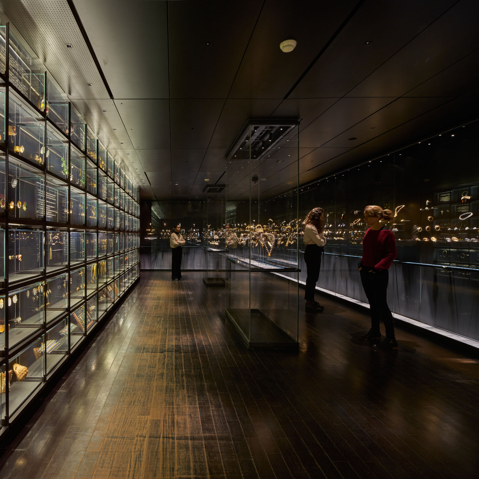 En 2004, l’aménagement de la Galerie des Bijoux avait été confié à Roberto Ostinelli, architecte suisse, qui avait souhaité donner une impression de faste et d’abondance. L’éclairage, alors basé sur l’utilisation de la fibre optique, faisait scintiller les bijoux. Au cours de l’année 2019, la Galerie des Bijoux a fait l’objet d’une modernisation qui a permis d’exposer les dernières acquisitions sous un nouvel éclairage LED, conçu par l’agence Voyons Voir.