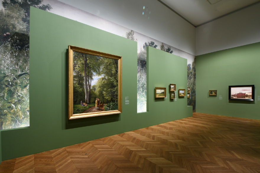 L’exposition du Petit Palais présente donc, outre Eckersberg et ses élèves, une grande diversité d’artistes, notamment de nombreux artistes dits « cosmopolites » qui se professionnalisent grâce à l’Académie royale, et aiment se portraiturer. Les peintres se mettent à voyager et rapportent de France, des rives de la Méditerranée, et en particulier de Rome, de très beaux paysages « où la lumière naturelle offre une couleur complètement différente de celle des pays scandinaves », remarque la conceptrice lumière. Ainsi, le parcours s’ouvre directement sur une salle où le tableau de Christoffer Wilhelm Eckersberg, Vue à travers trois arches du troisième étage du Colisée, 1815, est reproduit dans le hall. La lumière naturelle, très présente dans ces tableaux, contraste avec les ambiances feutrées des portraits de la salle suivante. Pour marquer encore plus cette différence, et comme on peut le voir sur la photo ci-contre en bas de page, Didier Blin a souhaité accompagner les peintures de paysages jusque dans la mise en scène : les tableaux sont accrochés sur des parois « décollées » de quelques dizaines de centimètres du mur sur lequel les paysages sont reproduits en grand.