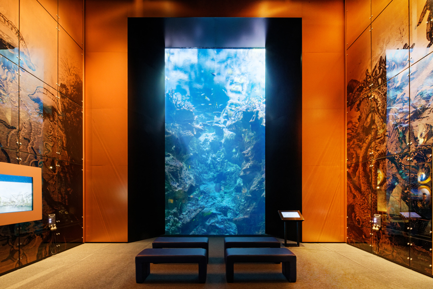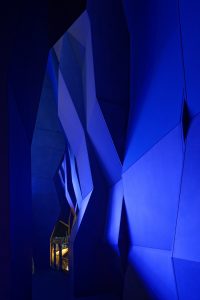 « La mise en lumière, explique Agnès Charvet, devait accompagner cette descente vers les fonds sous-marins de plus en plus sombres. Le défi consistait donc à limiter les luminances et les éclairements tout en apportant un certain confort lumineux ! On en voit tout de suite un exemple lorsqu’on emprunte l’escalier et que l’on pénètre dans la faille pour s’enfoncer dans les profondeurs : la lumière y est douce et diffuse, et les projecteurs, dissimulés dans le somment de la faille, restent invisibles. »