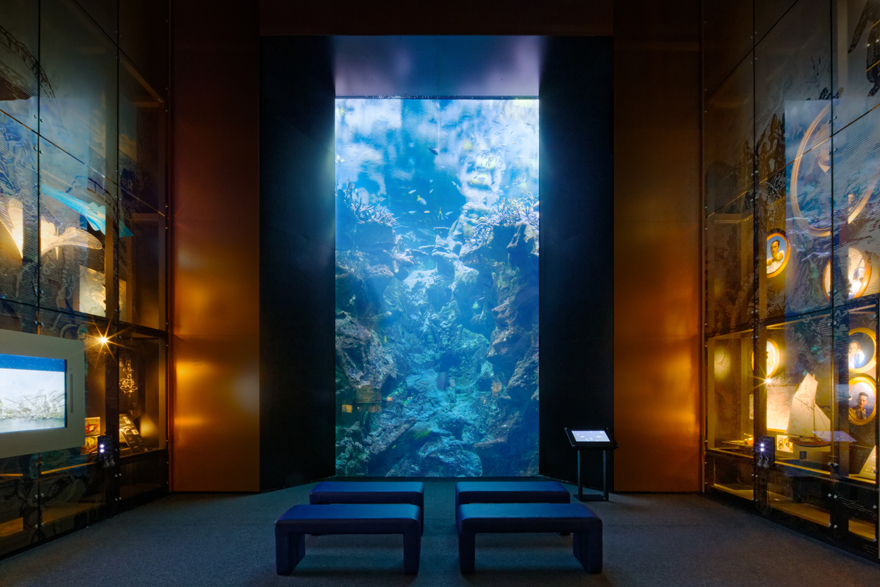 De cet espace, on peut apercevoir la salle Jules-Verne avec l’Aquarium Abyssal. Le nouveau parcours offre plus de recul qu’auparavant sur cette colonne de 10,70 m de profondeur remplie de 350 000 litres d’eau, et comprenant plus de 1 000 poissons polynésiens. Un film de cuivre a été positionné sur les parois vitrées à droite et à gauche de l’aquarium. La conceptrice lumière a créé un scénario qui fait apparaître et disparaître les objets qui se trouvent derrière les vitrines : lorsque la paroi est éclairée, on n’aperçoit que les dessins sérigraphiés de Jules Verne, mais lorsqu’elle est éteinte, on voit distinctement les objets disposés derrière la vitrine.