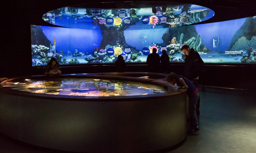 Dans les espaces immersifs, notamment la salle dotée des bassins tactiles et d’écrans qui laissent voir les animaux nageant sous la surface de l’eau, il était essentiel de limiter les luminances. « Pour ce faire, ajoute la conceptrice lumière, nous avons disposé des appareils à cardan au-dessus du plafond miroir : ils n’éclairent que les circulations piétonnes, incitant le visiteur à bouger dans l’espace. Même si tous les matériaux mis en œuvre sont noirs et peu réfléchissants, nous devions trouver le moyen de réduire le plus possible les reflets,