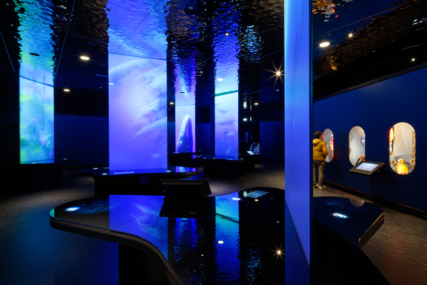Le principe général de la Cité de la Mer repose sur un accompagnement du voyage scénographique par le contrôle des ambiances et des reflets de lumière comme dans la deuxième salle, où le visiteur avance au milieu d’images d’apnéistes et d’espèces marines projetées sur cinq lames de verre hautes de 3 m. Ces lames surplombent cinq tables tactiles qui permettent d’en savoir plus sur l’apnée, les dauphins, les requins, les cachalots et les images sous-marines.