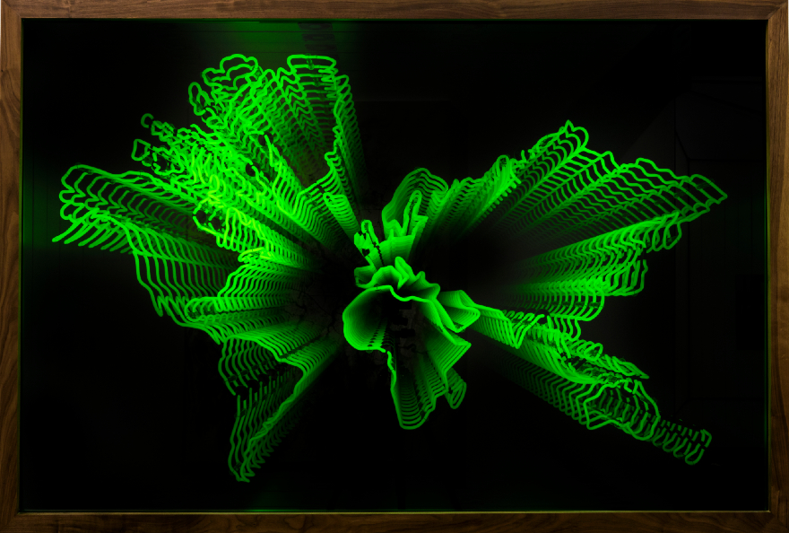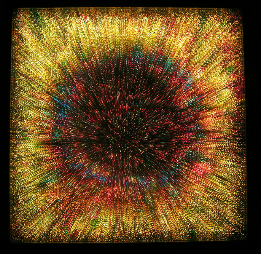 Pour la première fois, Iván Navarro, qui a tant joué de la frontière entre design, architecture et sculpture, s’empare du pinceau. A l’intérieur des miroirs sans tain, il a gravé puis peint, dans une gestuelle répétée, les milliers de touches de couleur vive qui métamorphosent la lumière des LED en explosions ou phénomènes célestes. Cathartique, cette pratique relève chez l’artiste d’une interrogation sur le couple moderne homme-machine. A l’objet, au miroir d’apparence industrielle, il oppose l’arbitraire de la main, l’unicité de la touche et la fragilité de l’être.