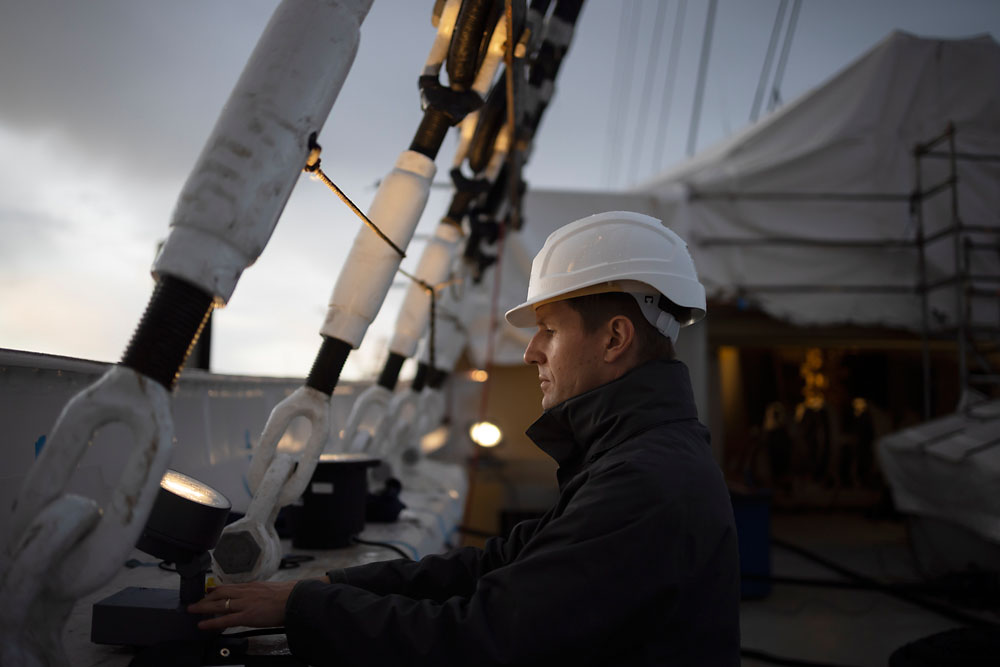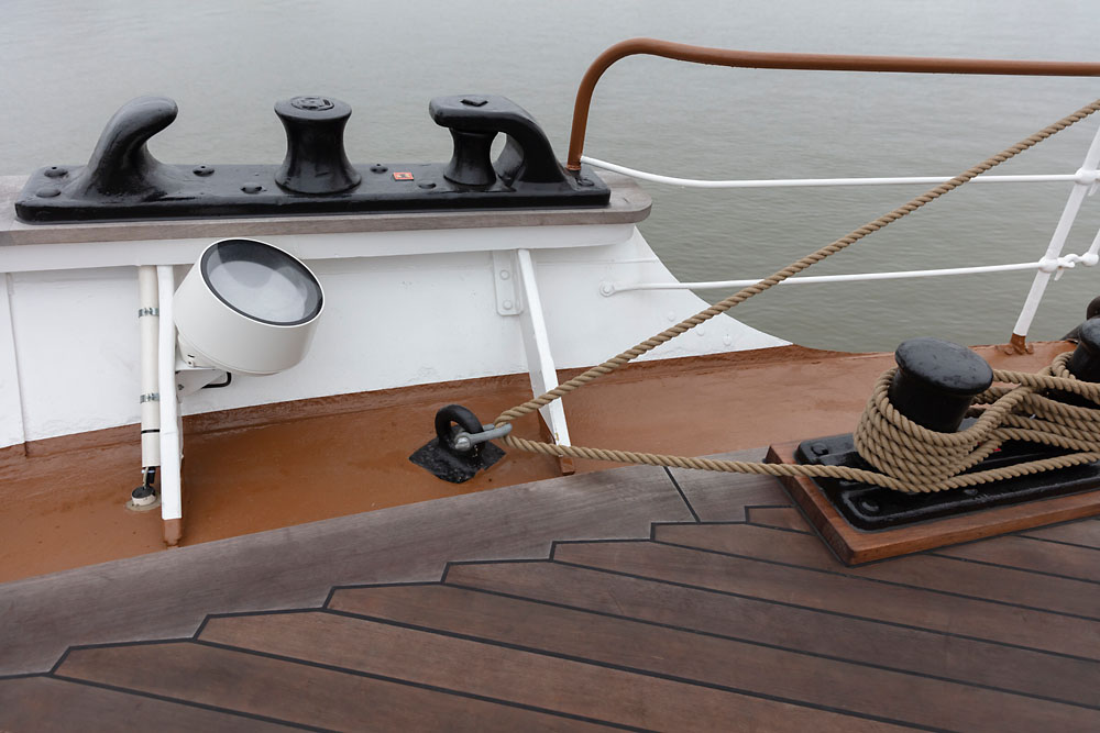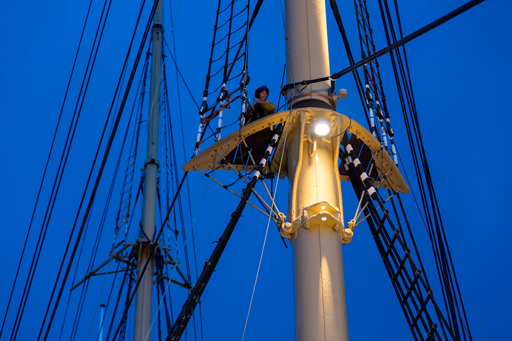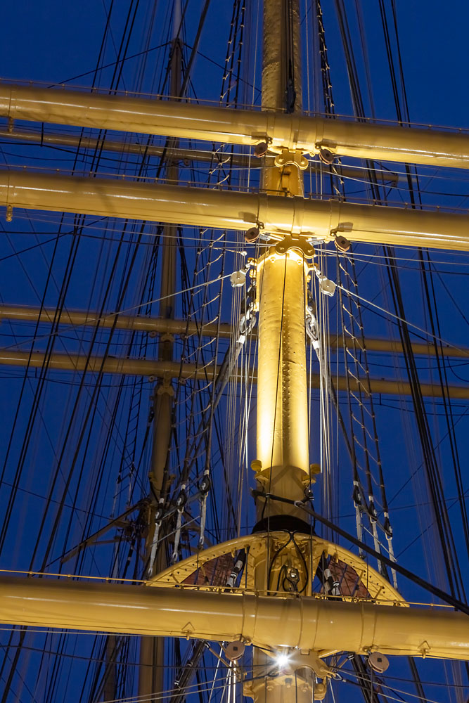 Les couleurs principales du Peking sont le noir, le blanc, le jaune et le marron. Tous les projecteurs pour extérieur Kona qui se situent au niveau de la coque, du pont et du gréement ont été individuellement adaptés à cette gamme de couleurs. De différentes tailles, niveaux de puissance et répartitions de lumière, les appareils d’éclairage s’intègrent ainsi parfaitement à la construction de ce voilier historique et sont eux-mêmes aussi peu visibles que possible. Sur l’ensemble du gréement du Peking, constitué de quatre mâts et d’un total de 18 vergues, des Kona de couleur genêt rappellent la peinture jaune de la construction en acier dans cette zone. Chaque mât abrite quatre projecteurs Kona dirigés vers le bas (2 x 48 W et 2 x 24 W), qui servent à éclairer les zones découvertes du pont avec la répartition de lumière Flood. Chaque mât est équipé de plateformes appelées barres de flèche. Les trois grands mâts présentent chacun deux barres de flèche, le plus petit mât une seule. Au-dessus de chaque barre de flèche sont montés trois Uplights Kona de 24 W chacun avec une répartition de lumière Spot, qui éclairent à la verticale.
