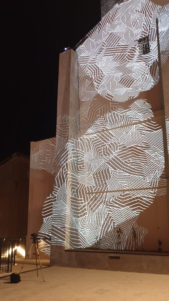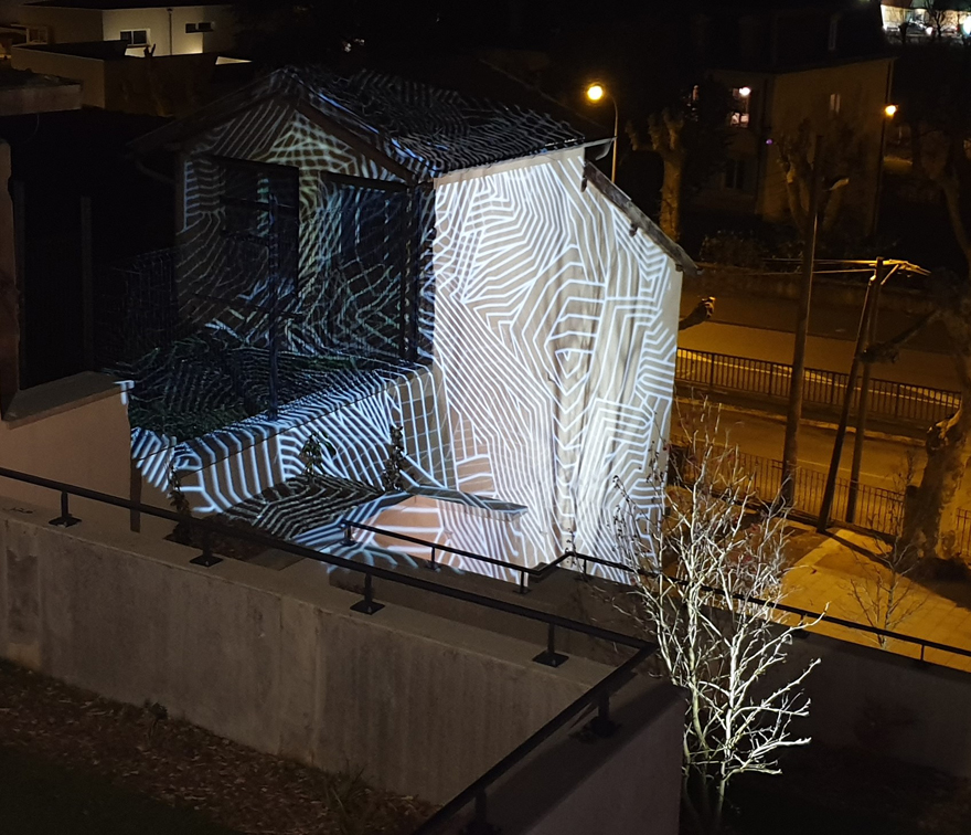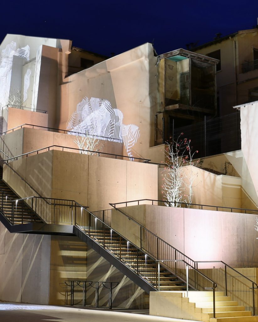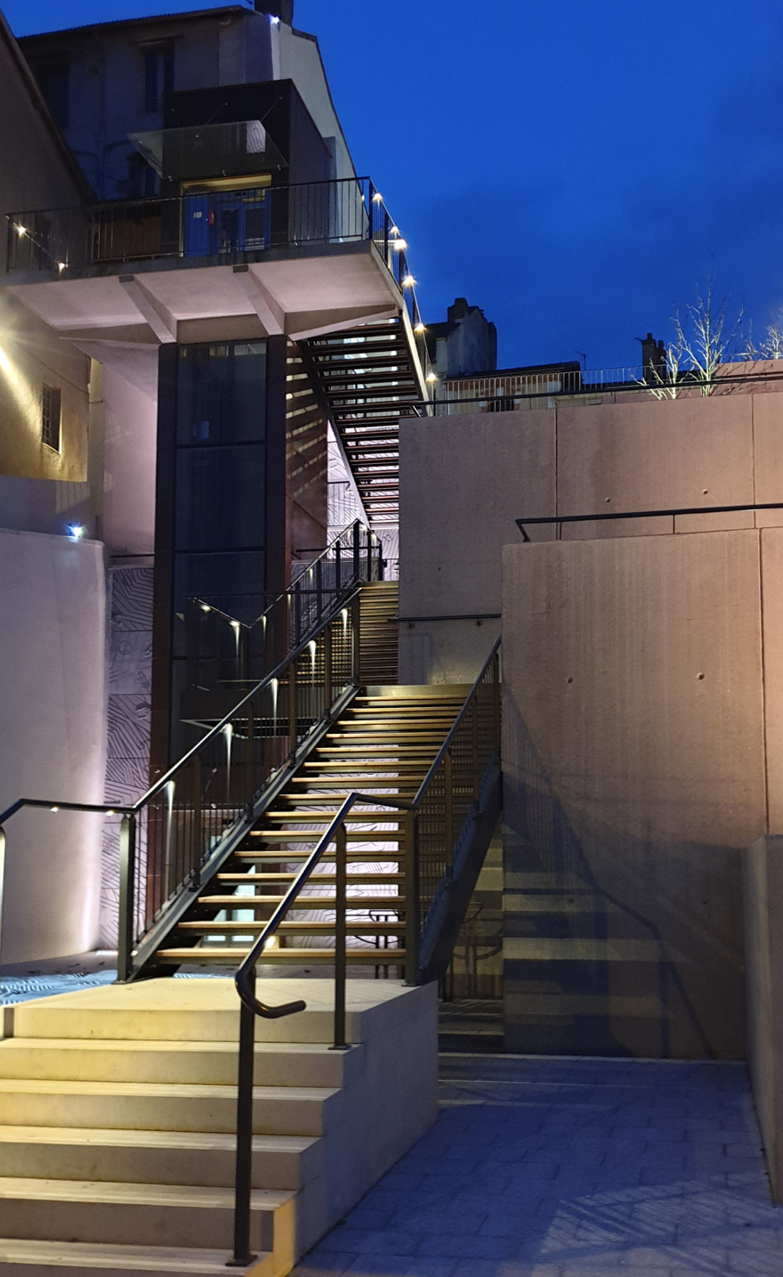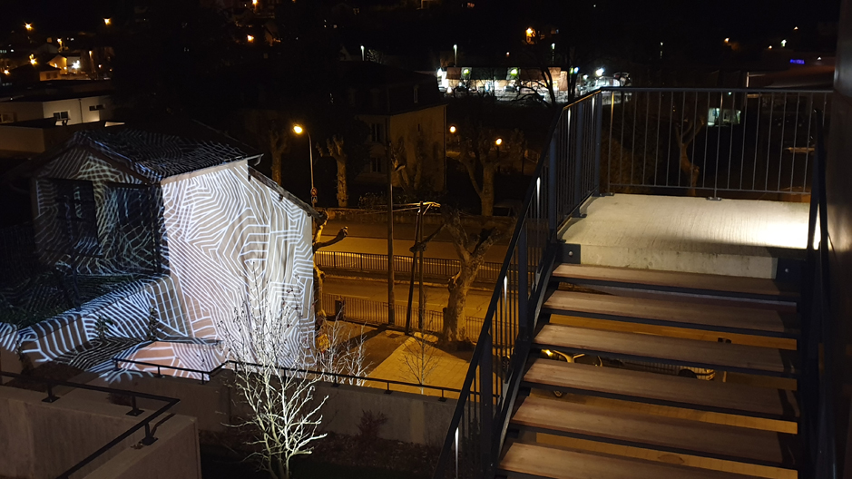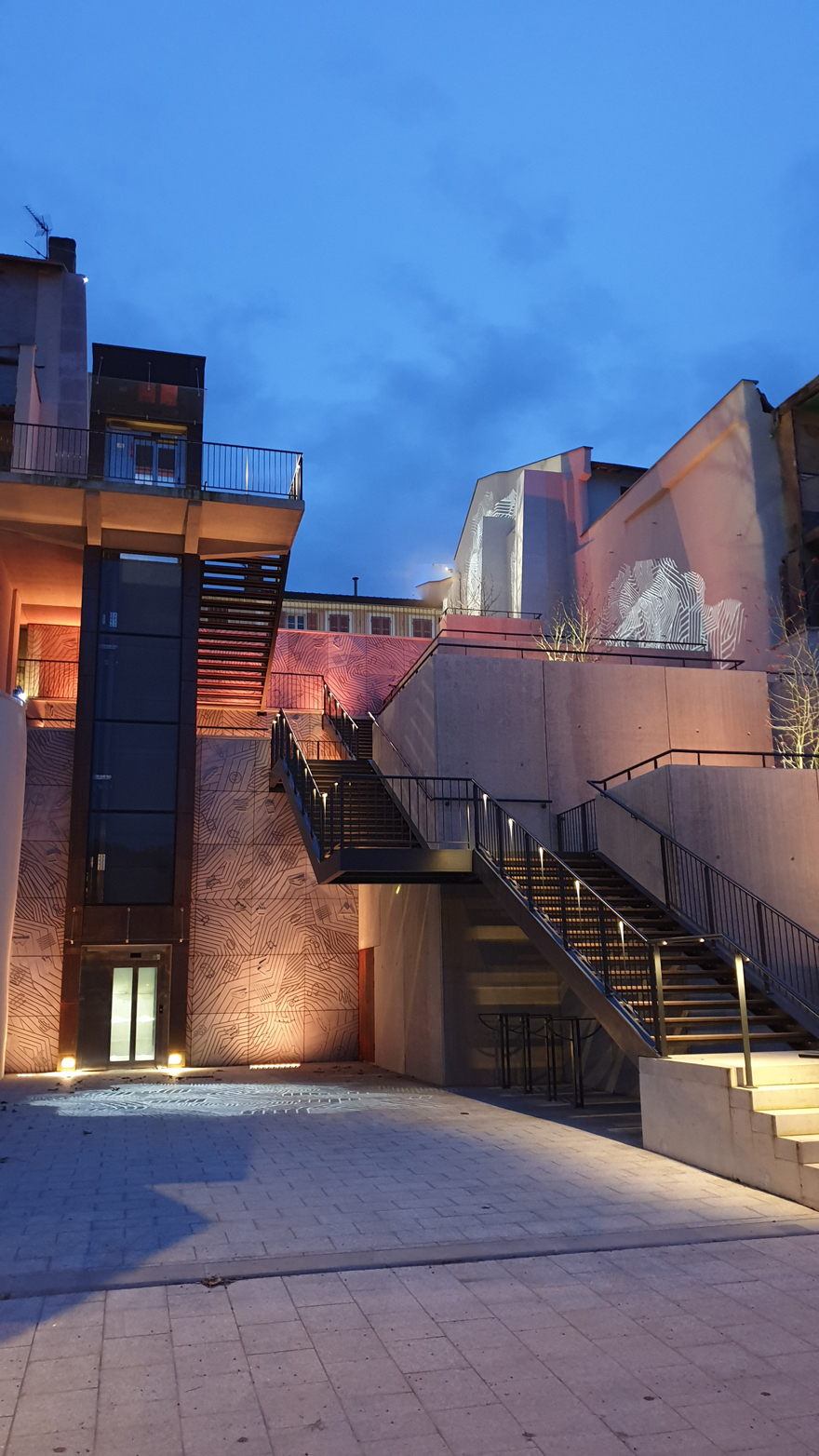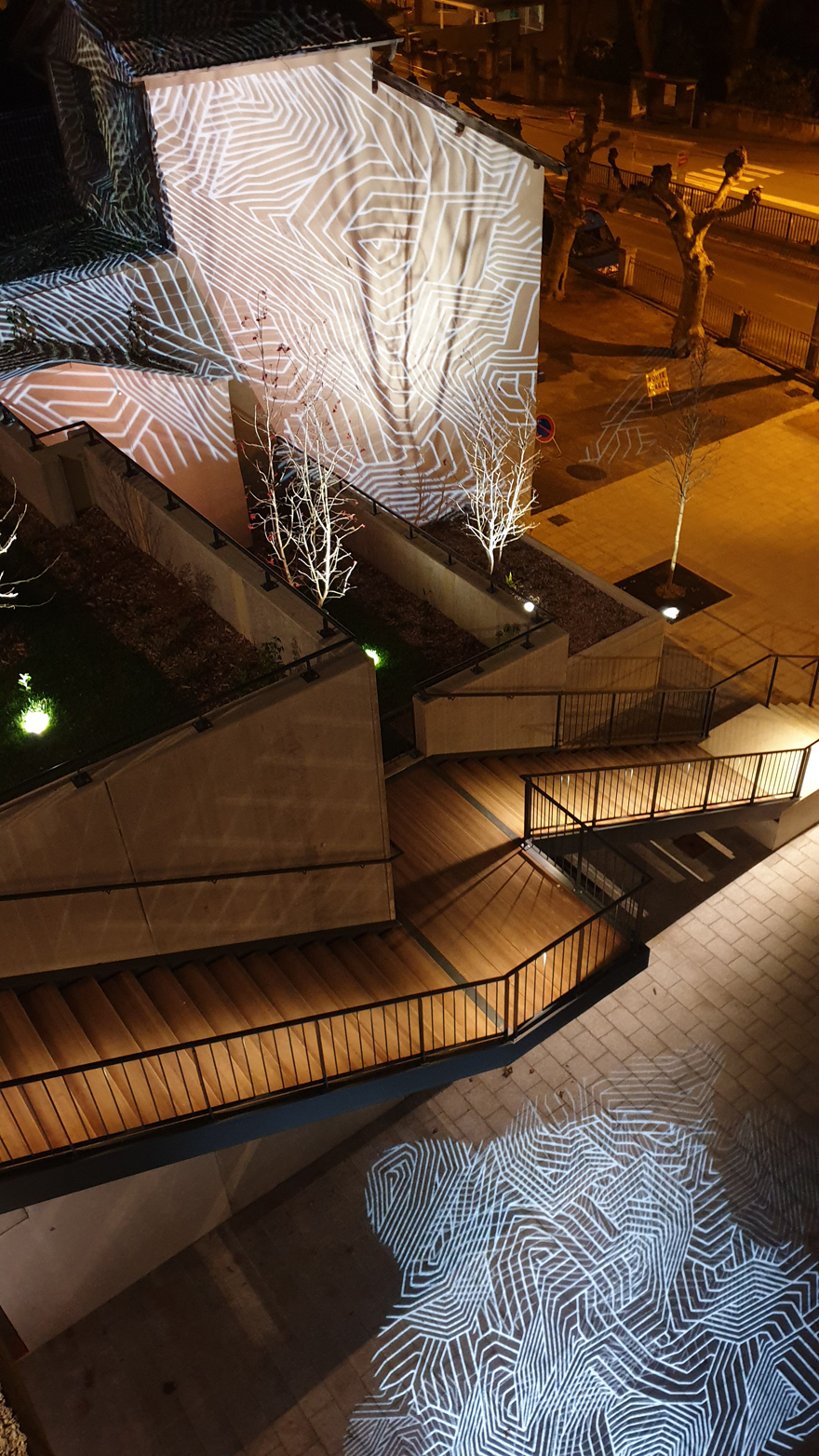 La mise en lumière évolue au cours de la soirée, avec des tons blancs durant la semaine et des lumières colorées le week-end ou lors d’événements particuliers. Des encastrés de sol, pilotés en DMX, éclairent les verticales et la fresque de Sébastien Mazauric, qui a pu jouer avec la lumière artificielle afin de générer des ombres sur son œuvre. « Aujourd’hui, ajoute Lionel Bessières, je n’utiliserais cependant pas cette typologie de luminaires qui illuminent les arbres, nous devons réapprendre à mieux respecter le ciel nocturne ! Les escaliers, quant à eux, sont éclairés à l’aide d’appareils miniatures, insérés dans les mains courantes et adaptés sur place lors des réglages. La lumière résiduelle se faufile entre les marches et vient, comme par magie, créer des effets inattendus sur le sol. Devant l’ascenseur, des images de gobos projetées au sol reprennent le même graphique que la fresque imprimée sur les parois béton et sur les façades aveugles environnantes. C’est grâce à la modélisation 3D que nous avons pu dimensionner la taille des projections des gobos au tout début du projet. »