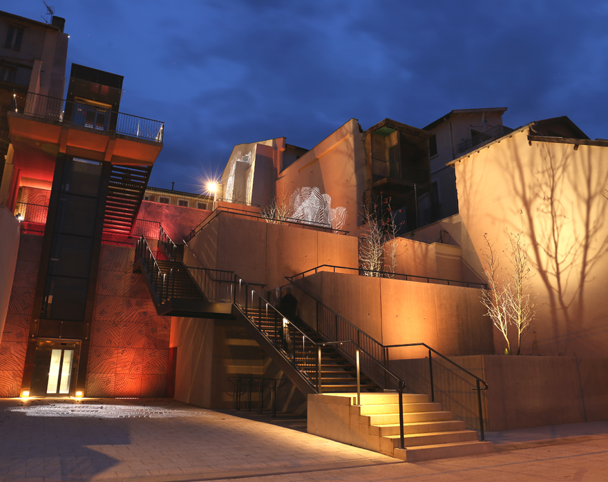Une fois n’est pas coutume : ici, la lumière naturelle occupe un rôle prépondérant dans l’aménagement du paysage et la perception de la percée pendant la journée. Le défi était de taille : il fallait que l’image nocturne des espaces fasse écho à l’œuvre des architectes et à ce que les habitants voient de jour. Le concepteur lumière s’était déjà familiarisé avec Decazeville quelques années auparavant lors de la mise en lumière du chevalement minier. Engagé dans l’étude éclairage dès le concours, Lionel Bessières a travaillé sur les volumes de la percée : « Cette brèche dans le tissu urbain s’ouvre sur une vue magnifique de la vallée, en bas de la déclivité ; nous étions en quelque sorte liés par cette perspective. Et même si, la nuit, les arbres disparaissent dans l’ombre, il fallait restituer cette respiration dans le bâti et comprendre les volumes imaginés par les architectes. Pour cette raison, nous sommes allés assez loin dès le début du concours en termes de rendus graphiques, d’images 3D et avons effectué un gros travail de modélisation afin d’anticiper le plus possible les effets lumière et de vérifier les niveaux d’éclairement dans les escaliers. » Requalifiée, la rue Cayrade a elle aussi bénéficié d’un nouvel éclairage, fonctionnel et simple, qui guide le piéton vers cette percée.