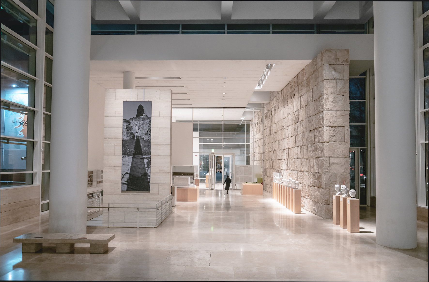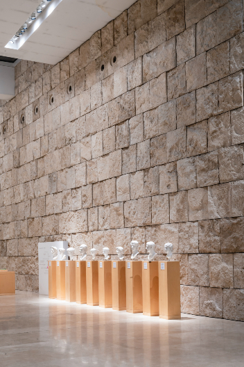 La traversée du musée mène du hall d’entrée, à travers un corridor, jusqu’à la salle d’exposition principale, haute de près de 12,50 m. Ici, une série d’appareils d’éclairage encastrés Lightcast (LED 32 W/3 000 K) assure l’éclairage général de l’axe de déplacement. Des projecteurs Parscan (LED 24 W/3 000 K) à répartition de lumière Flood (28°) ainsi que des projecteurs à faisceau mural Parscan (LED 24 W/3 000 K) rendent perceptibles les dimensions particulières de la pièce grâce à un éclairage vertical uniforme des murs, tout en soulignant leurs surfaces en blocs de travertin fin de Rome. Des projecteurs Parscan à répartition de lumière Narrow spot (6°) et un module LED de 8 W projettent des cônes de lumière précis sur une série de bustes antiques qui marquent le passage vers la salle principale.