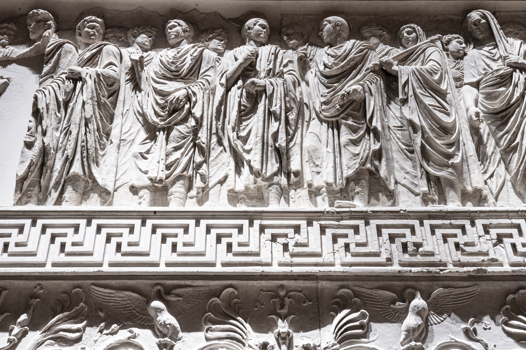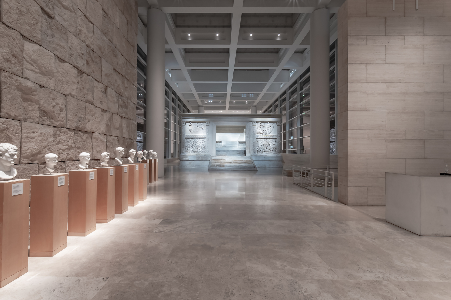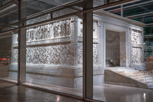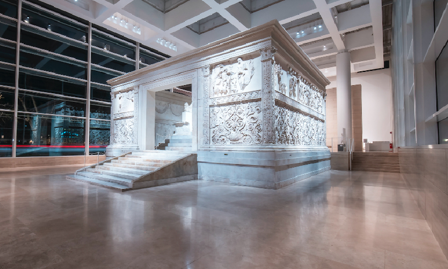En l’honneur de l’empereur Auguste, revenu victorieux à Rome, le sénat romain commanda en l’an 13 av. J.-C. un somptueux autel en marbre. Les provinces étaient enfin pacifiées après des décennies de guerre civile, la Pax Augusta était une promesse de stabilité et d’abondance. Les faits d’armes du souverain et de sa famille représentés en relief sur le mur d’enceinte de l’Ara Pacis Augustae devaient devenir un modèle pour les citoyens de l’empire. Depuis 2006, l’Autel de la Paix d’Auguste, qui fait partie des monuments antiques les plus importants de Rome, peut être admiré dans le Musée de l’Ara Pacis, non loin du Tibre. Le bâtiment aéré conçu par Richard Meier & Partners comprend, en plus de la grande halle vitrée qui abrite l’autel, des espaces consacrés aux expositions temporaires.