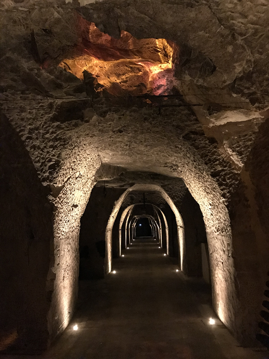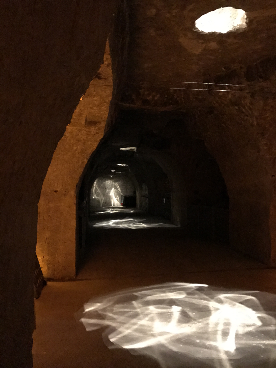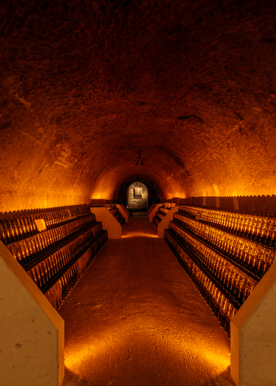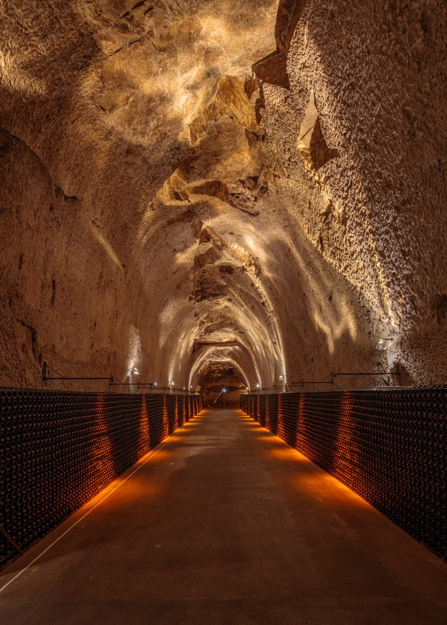 Le parcours entraîne les visiteurs jusque dans les galeries-caves où les bouteilles sont disposées sur des pupitres inclinés (chevalets en chêne) pour la deuxième fermentation qui transforme le vin tranquille en vin effervescent. Le dépôt descend lentement vers le col, suivant l’inclinaison des bouteilles jusqu’à ce qu’elles soient amenées à la verticale par le remueur. De petits spots, fixés au sol, projettent une lumière orangée (longueur d’onde de 590 nm) sur les pupitres et les voûtes, tandis que des réglettes en sous-faces des pupitres tracent des bandes régulières perpendiculairement au cheminement. Dans l’allée principale, le concepteur lumière a créé deux saillies de chaque côté pour encastrer des appareils au sol, ponctuant, comme des bougies, la déambulation de lumières plus blanches.