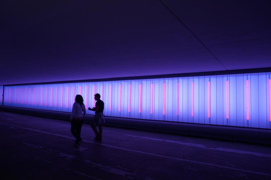 Afin d’intégrer cette structure le mieux possible au paysage urbain, Seulsoleil, avec LightAct et visible.digital ont créé un éclairage interactif qui rend compte du trafic routier. « Nous avons symbolisé, au plafond, précise François Gaunand, en sous-face, les trois voies de circulation au nord et au sud par des lignes de lumière et des flashs qui changent d’intensité en fonction de la densité et de la vitesse du trafic. » Les tubes sont connectés aux caméras qui, positionnées sur le périphérique, leur envoient les informations liées au trafic via des algorithmes qui, à leur tour, les retransmettent en effets lumineux.