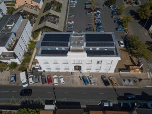 Les panneaux solaires, installés en toiture ou en terrasse, permettent de produire de l’électricité. Celle-ci peut être revendue, mais aussi utilisée en autoconsommation pour le fonctionnement des communs. Des panneaux solaires thermiques peuvent également produire de la chaleur destinée au chauffage ou à la production d’eau chaude sanitaire (ECS).