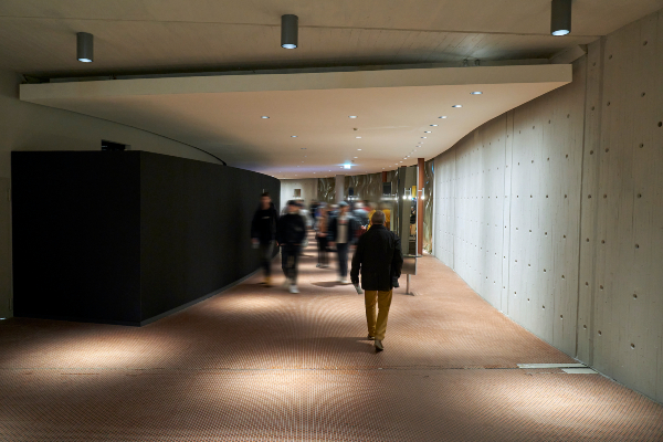 Dans la galerie qui relie la nouvelle entrée au grand foyer prestigieux, le concept d’éclairage existant a été optimisé avec des appareils encastrés à LED (commande DALI, LED 24 W) : « Nous avons conservé la position des downlights telle que prévue dans le concept d’origine de 1970, explique le concepteur lumière Clemens Tropp. Au moyen des nouveaux appareils d’éclairage à répartition de lumière Spot créés avec l’équipe d’ERCO individual, nous avons volontairement conçu des îlots de lumière qui marquent des repères sur le sol et font ressortir encore mieux la structure du carrelage mosaïque. »