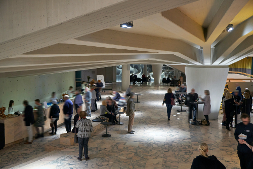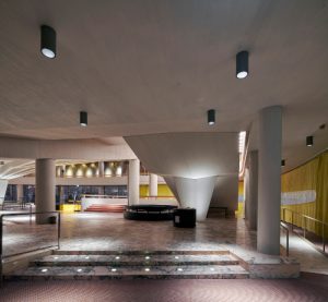 Bernhard Pfau a organisé le grand foyer autour d’un massif pilier en forme de cône inversé qui supporte un total de 23 traverses en béton armé allant jusqu’à 15 mètres de long qui se déploient en rayons. Lors de la rénovation, cet élément d’architecture essentiel a été mis en lumière de façon particulièrement spectaculaire. Des encastrés de sol Tesis ont été modifiés de sorte à pouvoir être positionnés aux emplacements existants, tout autour du pilier. Ils éclairent l’imposant pilier ainsi que la structure nervurée du plafond selon un tracé précisément défini du bas vers le haut et du centre vers l’extérieur.