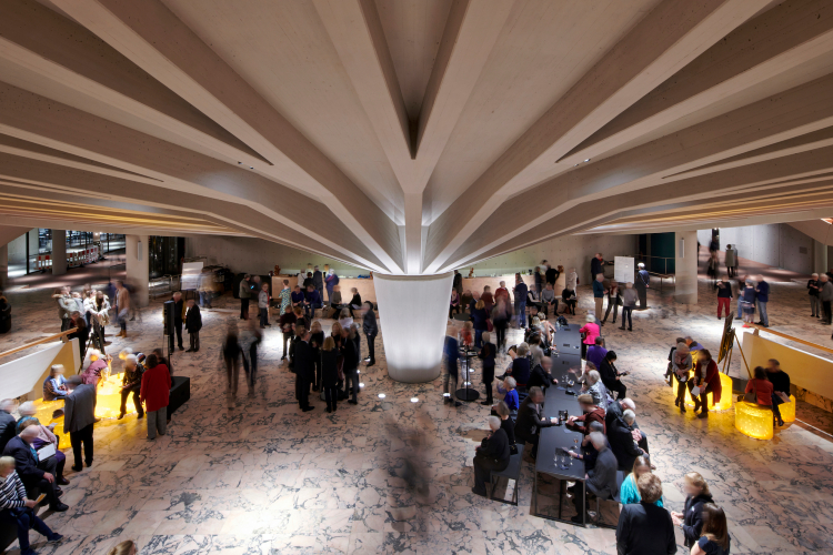 De nouveaux appareils à faisceau mural à sortie de lumière réglable mettent en scène les murs en béton apparent de la galerie, restaurés avec soin. L’ensemble de l’éclairage du foyer, converti en appareils à LED sans maintenance, économes en énergie et à longue durée de vie, se pilote via DALI en toute flexibilité. « Différents scénarios lumineux ont été préprogrammés pour les différents types d’utilisation du foyer (accueil, entracte ou encore lecture), et peuvent être déclenchés selon les besoins », explique le concepteur lumière Clemens Tropp.