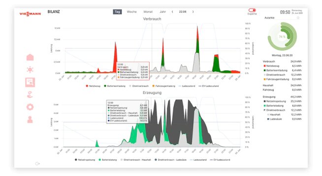 Le prix des batteries de stockage étant encore élevé, Viessmann mise sur le stockage énergétique sous forme de chaleur et l’optimisation de l’autoconsommation des générateurs de chaleur. « Nous avons sorti la GridBox, une box qui permet de faire de la visualisation et de la gestion des flux électriques dans l’habitat. Elle se branche sur le routeur, en local, et permet à l’utilisateur de visualiser la production photovoltaïque, le stockage sur les batteries et également la consommation de la pompe à chaleur, par exemple. Elle assure la transparence des flux d’énergie dans la maison. Le tableau de bord énergétique visualise et traite de manière transparente les flux énergétiques du système de stockage d’électricité, du système photovoltaïque, de la pompe à chaleur et de la consommation de l’habitation, explique Jérôme Dufour, Chef Produit & Marchés pour Climatisation et Solutions électriques & Photovoltaïques de Viessmann. Le consommateur verra sa consommation à l’instant t ou sur une période personnalisée. Il aura accès à un historique de son empreinte carbone et à son taux d’autoconsommation. »