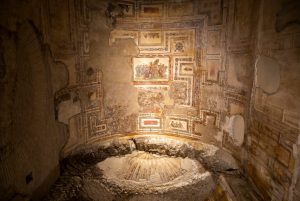 La Domus Aurea (Maison dorée) – son immense coupole dorée était l’un des nombreux éléments décoratifs opulents – et ses édifices « semblables à des villes » occupaient à l’origine une superficie totale 25 fois supérieure à celle du Colisée.Après le suicide de Néron, ses successeurs tentèrent d’effacer son règne embarrassant. Le palais et les terrains furent dépouillés de leurs revêtements précieux. Ils furent enfouis sous terre ; des constructions furent réalisées par-dessus. Les passages excavés, des voûtes et des centaines de pièces sont fermés au public depuis plusieurs décennies pour la réhabilitation et la restauration du site. Enfoui sous des mètres de boue du parc, le palais de 2 000 ans est continuellement attaqué par l’eau, les sels corrosifs et les racines des arbres.