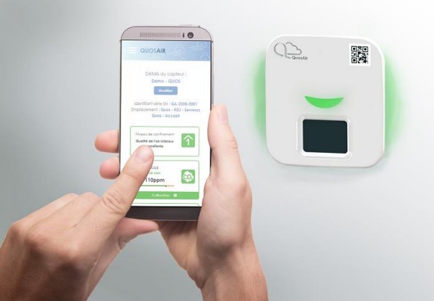 L’entreprise française a commencé en lançant un capteur de CO2 « nouvelle génération » qui permet de mesurer en temps réel la température, l’humidité et le taux de CO2. Fabriqué en France, il est connecté à la plateforme Quoslive pour faire des analyses durables et adapter les systèmes de ventilation ou de climatisation.