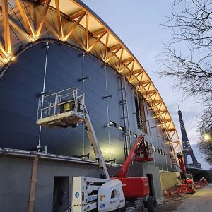Conçu par l’architecte Jean-Michel Wilmotte, le Grand Palais Éphémère est, comme son nom l’indique, un bâtiment éphémère d’une superficie de 10 000 m2, édifié sur le Champs de Mars. Il se situe juste en face de la Tour Eiffel, où il restera pendant 4 ans avant d’être démonté. Son ossature en bois et ses vertus écologiques en font un bâtiment remarquable, résolument ancré dans notre époque.