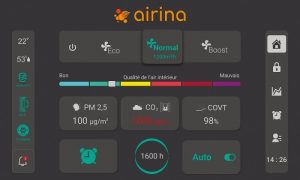 « Airina peut réaliser jusqu’à 5 renouvellements d’air complets par heure (en lien avec la recommandation de la haute autorité de la santé) et donc 200 m2, ce qui en fait un purificateur à haute performance. »