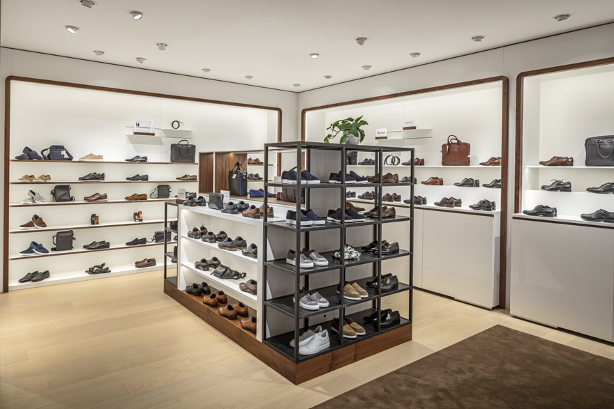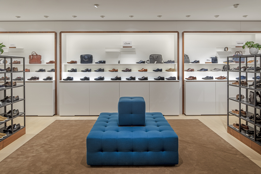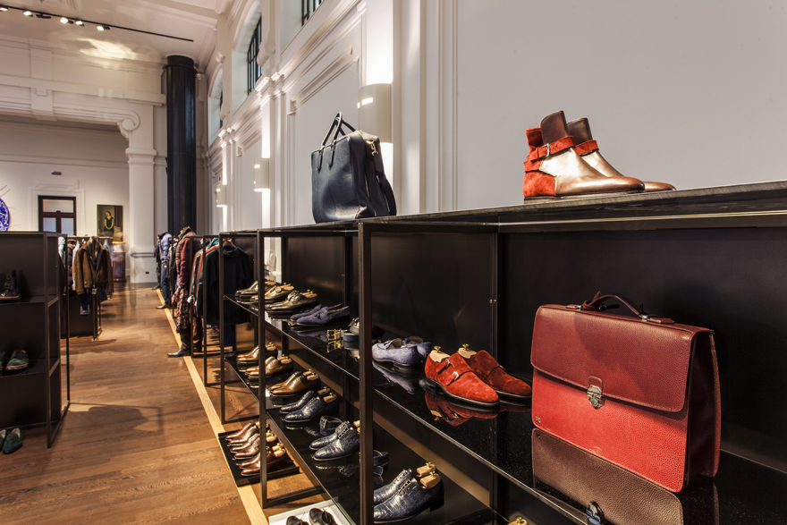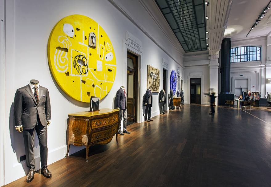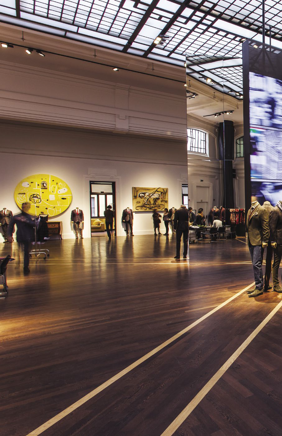 Malgré les huit mètres de haut de la vaste halle principale du bâtiment Art nouveau, la lumière led brillante oriente consciencieusement le regard des clients sur les costumes, chemises et accessoires. Un subtil rendu des couleurs, des contrastes et des accents prononcés font ressortir matières et détails.