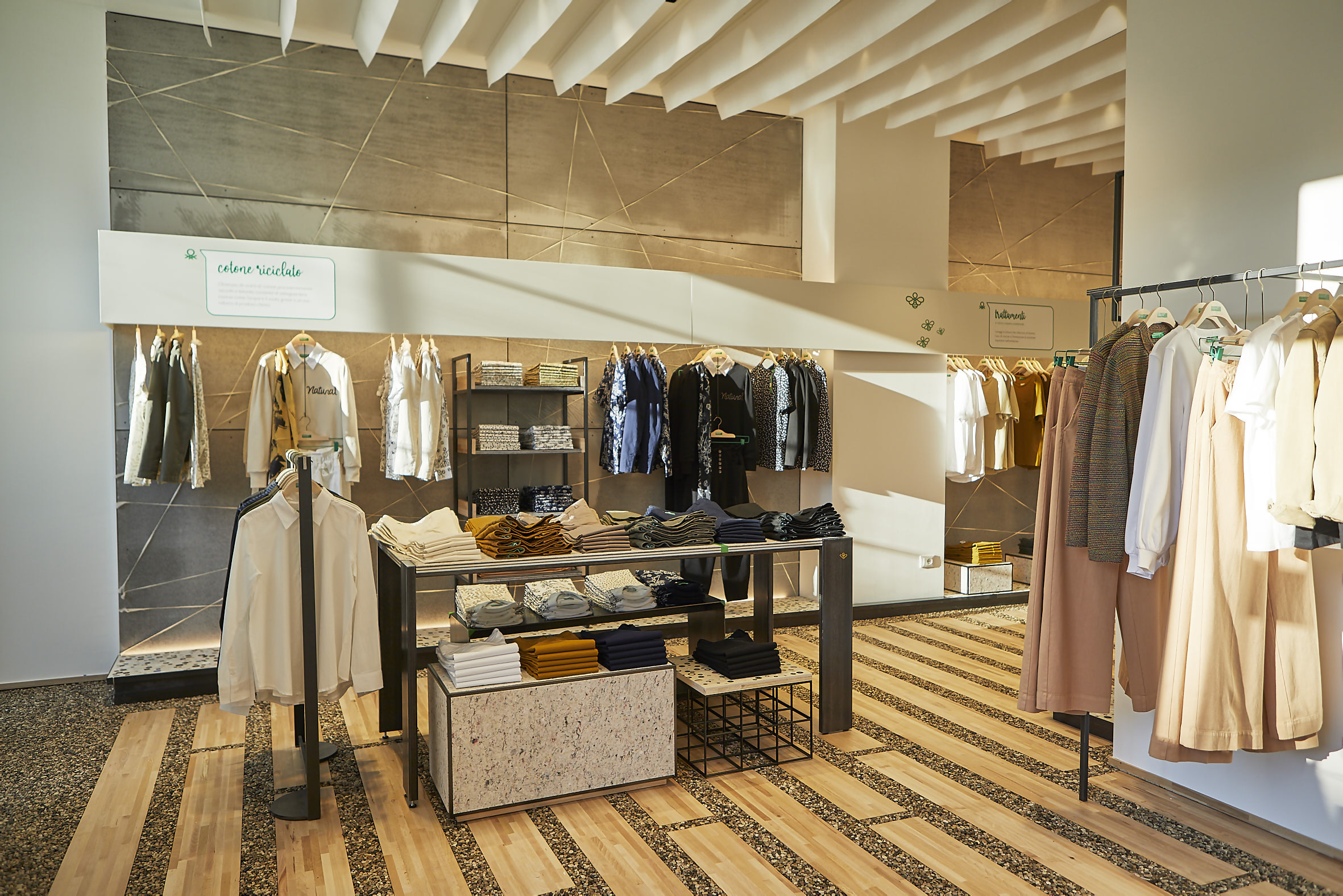 Le point de vente s’étend sur un seul étage de 160 m², avec des matériaux naturels régénérés. Le sol est constitué de gravier provenant du fleuve Piave et de bois de hêtres abattus par la tempête Vaia. Les murs sont traités avec une peinture minérale résistante aux bactéries et aux moisissures qui réduit également les polluants dans l’environnement. Outre les matériaux naturels, on trouve des matériaux créés à partir d’un mélange de déchets de l’industrie textile. Des boutons usagés ont été mélangés à de l’hydrorésine pour devenir des plateformes de périmètre et des bases de stands d’exposition. La laine recyclée a été réutilisée comme motif sur le revêtement du périmètre et comme décoration pour les rideaux des vestiaires. Et un matériau spécial, appelé « rossino », fabriqué à partir de fibres textiles recyclées mélangées, donne vie aux étagères, aux bases d’exposition et aux mannequins.