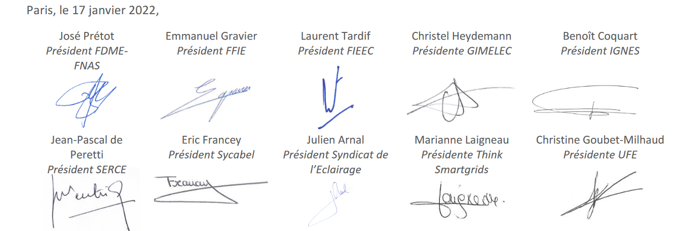 Les présidents des 10 fédérations et associations professionnelles de la filière électrique (FDME–FNAS, FFIE, FIEEC, Gimelec, Ignes, Serce Sycabel, UFE, Syndicat de l’éclairage et Think Smartgrids) ont signé l’engagement de tout mettre en œuvre pour atteindre la neutralité carbone en 2050. Cet objectif repose sur deux défis majeurs : réduire les consommations énergétiques de plus de 40 % et sortir des énergies fossiles d’ici à 2050, ce qui se traduit par une croissance de la part de l’électricité dans la consommation finale d’énergie, de 25 % aujourd’hui à 55 % à cette échéance.