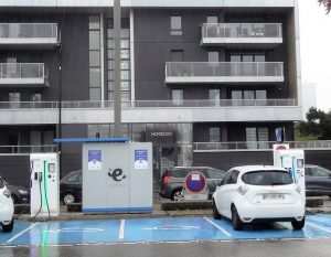 Toutes les grandes chaînes de supermarchés ou de centres commerciaux se sont lancées dans un programme d’équipement de leurs parkings en bornes de recharge pour permettre à leurs clients de recharger leur véhicule pendant les 30 minutes à 1 heure passées dans leur magasin. Ces bornes sont éventuellement couplées à une production d’électricité photovoltaïque sur des ombrières.