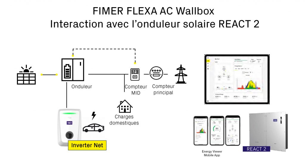 - la borne FLEXA AC WALLBOX pour pose murale ou sur potence de 3,7 à 22 kW (monophasé – triphasé) disponible en version « StandAlone » pour une gestion locale et en version « FutureNet » et « InverterNet » pour une communication avancée compatible avec la gestion de flotte ou avec la combinaison à un onduleur solaire Fimer. La version monophasée (3,7 kW et 7,4 kW) intègre la gestion dynamique de puissance (load management), parfaitement adaptée à un usage résidentiel, grâce au capteur de courant fourni. L’application MyFIMERwallbox donne pleine visibilité à l’utilisateur. La version triphasée dispose aussi de limitation de puissance par l’ajout d’un compteur MID standard. Les parkings collectifs utiliseront la gestion RFID, la communication avancée OCPP 1.6 Json et la configuration maître/esclave pour gérer différents points de charge d’un ou plusieurs sites ;