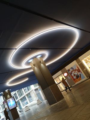 Installation de S lumineux dans le passage du centre commercial Saint Sébastien. Les profilés en S mesurent 60m déroulés. Ils éclairent grâce à des rubans LED de type 2835.
