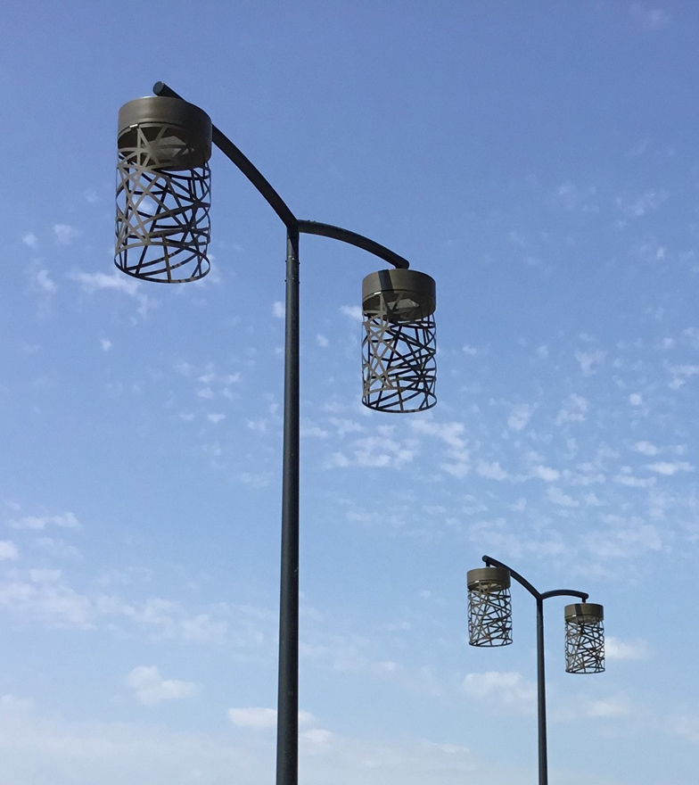Plusieurs modèles ont été installés selon les espaces à éclairer : 16 leds avec un flux de 4 720 lm, 24 leds de 7 080 lm et 32 leds 9 440 lm. Le Lampion fait 400 mm de diamètre sur 660 mm de haut. Pensé pour l’éclairage décoratif, Lampion est une gamme de luminaires cylindriques de type photophore se présentant sous la forme d’une cage ajourée en acier inoxydable suspendue à un logement électrique en aluminium et protégée par un verre trempé IK08. Pour restituer un éclairage d’ambiance, la gamme Lampion dispose d’un bloc optique IP66 et d’un driver compatibles Zhaga intégrés dans la tête du luminaire qui permettent, via une large gamme de températures de couleur et photométries, de répondre à de nombreux besoins en veillant au respect de la réglementation contre les nuisances lumineuses.