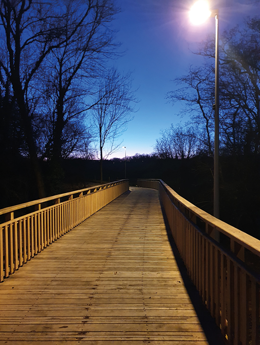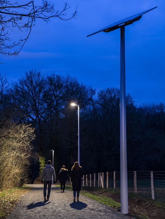 La voie est éclairée par des candélabres à led à détection de mouvement. Le luminaire Ello d’Abel Éclairage a été retenu pour sa forme fine et intemporelle. Son design plan et aérien permet d’accueillir les équipements d’éclairage intelligent : un noeud de communication positionné sur le dessus du luminaire et un capteur de présence intégré sur le dessous de la fonderie. La connectivité créée entre les points lumineux sert à la configuration d’un éclairage dynamique de type chemin lumineux. Tel était le souhait de l’Agglo sur ce projet : optimiser l’éclairement en fonction de la fréquentation dans une logique d’économie d’énergie. La solution proposée par Abel Éclairage est une ambiance lumineuse réduite à 10 W en veille et une élévation de la puissance à 30 W pendant 40 secondes après une détection.