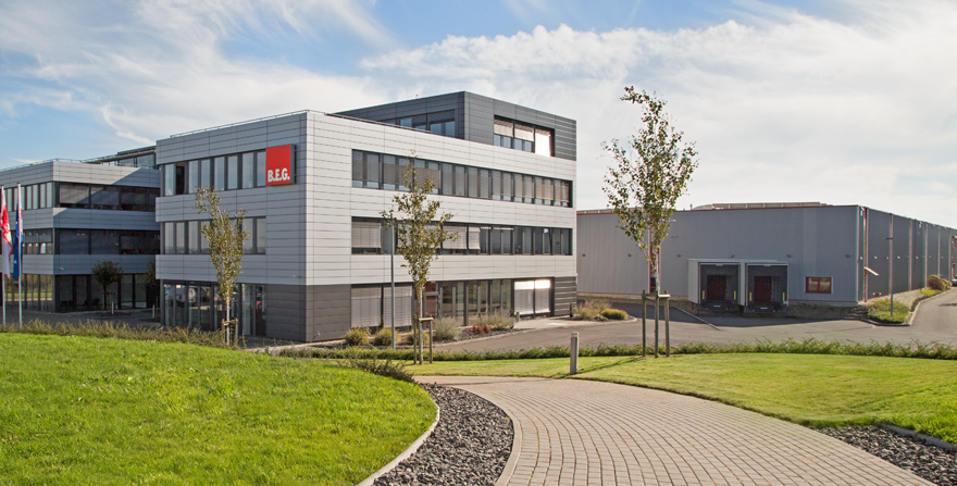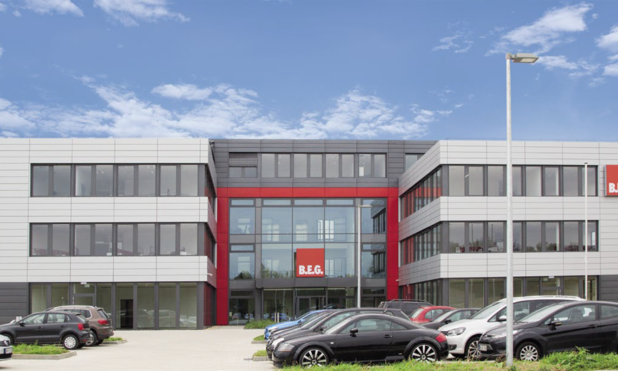 Situé à Lindlar, à quelques kilomètres de Cologne en Allemagne, le siège social de B.E.G. compte deux bâtiments : l’un, construit en 1975 et l’autre, en 2014. À la fois siège de l’entreprise, centre de formation, bureau d’études, entrepôt central et centre de logistique, les bâtiments abritent 4 000 m² de bureaux et 8 000 m² dédiés au stockage et à la distribution des produits. 150 employés y sont rattachés, sur un total de 250 collaborateurs à travers le monde. Le bâtiment est une vitrine technologique pour le fabricant allemand, doté d’un système d’éclairage automatisé KNX et d’une supervision, ainsi que de sources d’énergies renouvelables.