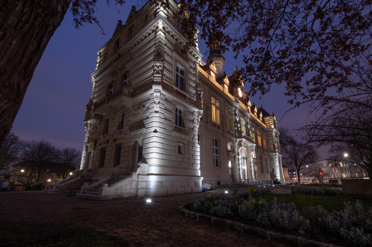 Sa toiture et son faîtage sont soulignés par un éclairage guidant le regard vers le haut. La hauteur du campanile (47 m), qui abrite une horloge et un carillon, est révélée par un éclairage depuis l’intérieur. Les matériaux et éléments architecturaux, en particulier les angles verticaux riches de modénatures, grotesques, armoiries de la république, blason de la ville, têtes de lions (symbole de force républicaine) sont également soulignés par des réglettes leds.