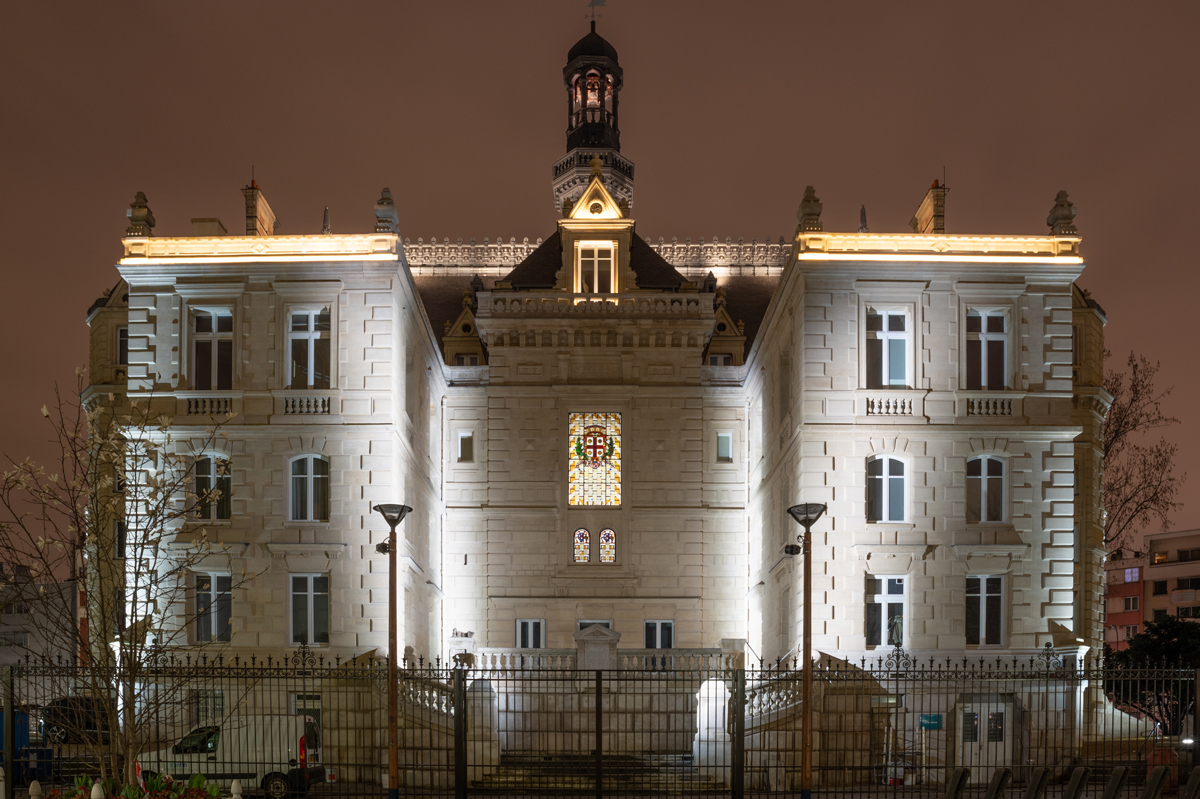 Entièrement réalisé en leds, un travail de sélection photométrique a permis de n’éclairer que les surfaces définies, en évitant toute déperdition vers le ciel. En n’éclairant que les éléments les plus visibles, la quantité de flux installés a été réduite. Un soin particulier a été apporté à l’intégration des équipements et des sources lumineuses. Des encastrés de sol soulignent les angles verticaux de l’architecture, le reste du matériel étant installé sur la façade, dissimulé aux regards.