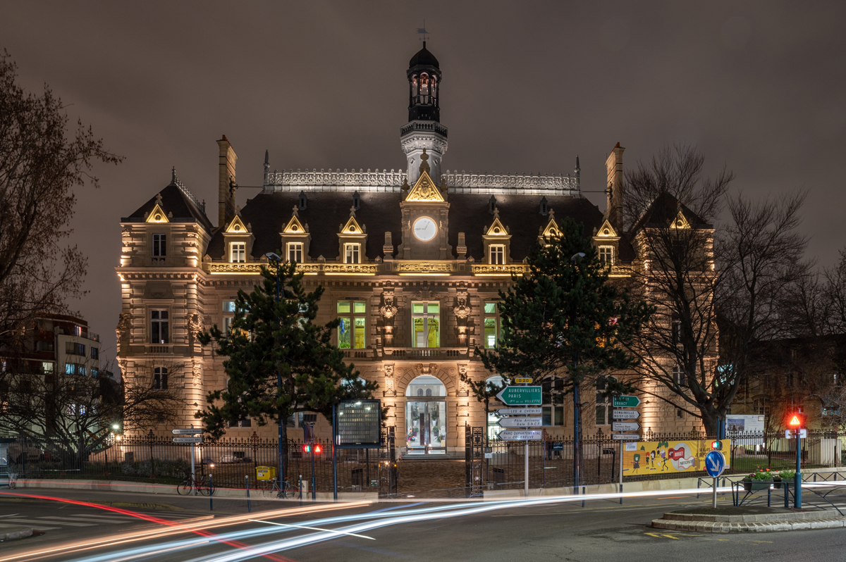À l’occasion de la restauration des façades et de la toiture de l’Hôtel de ville, la municipalité a souhaité mettre en valeur cet édifice, érigé à la fin du XIXe siècle. Situé à la croisée d’avenues, à proximité de la gare RER et du Canal de l’Ourcq, le bâtiment est visible de toute part.