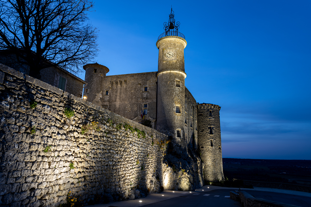 La municipalité a souhaité renforcer son attractivité en mettant en lumière les façades Sud et Est, ainsi que les tours et le mur de soutènement, tous visibles depuis la plaine. Un éclairage rasant blanc (température de couleur de 4 000 °K) permet de restituer les coloris naturels de la pierre et des rochers. Il met également en valeur l’osmose réussie entre le bâti et son socle rocheux en projetant les ombres des excroissances rocheuses et des végétaux s’accrochant aux parois. La façade sud et l’horloge sont éclairées par un éclairage directionnel. L’intégration des équipements a été particulièrement soignée pour dissimuler aux regards les appareils et les passages de câbles.