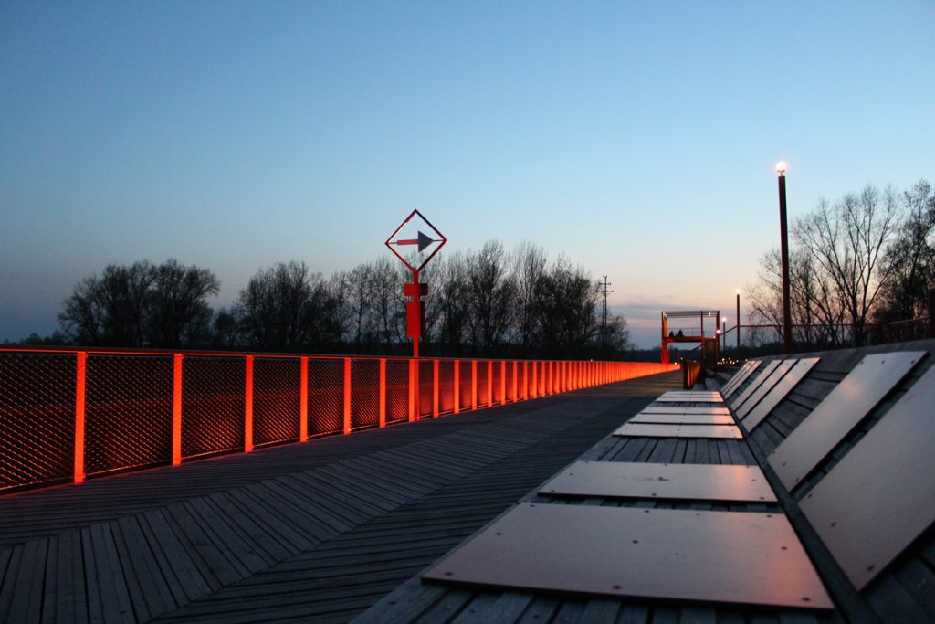 Des mâts spécifiques éclairent le cheminement piétonnier, tandis qu’à leur sommet, des lanternes inspirées du monde ferroviaire balisent l’ouvrage. Depuis les berges, seuls le liseré du garde-corps et la balise du mât sont perceptibles.